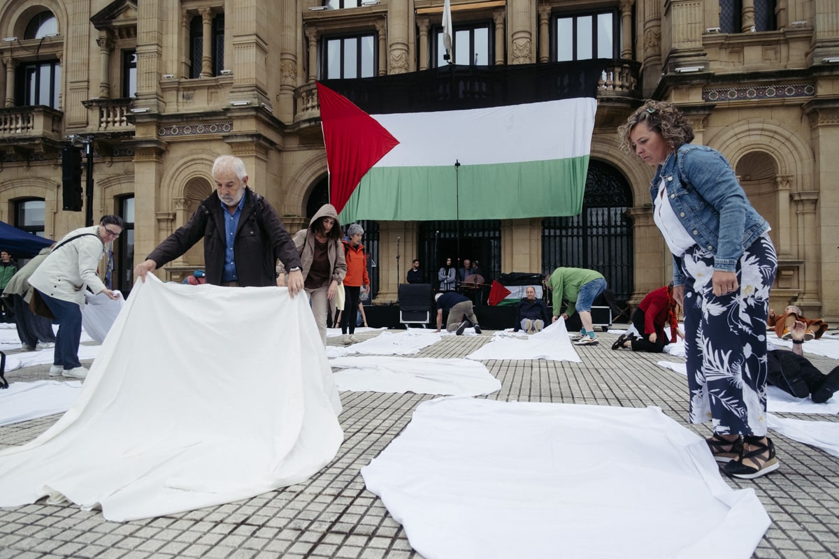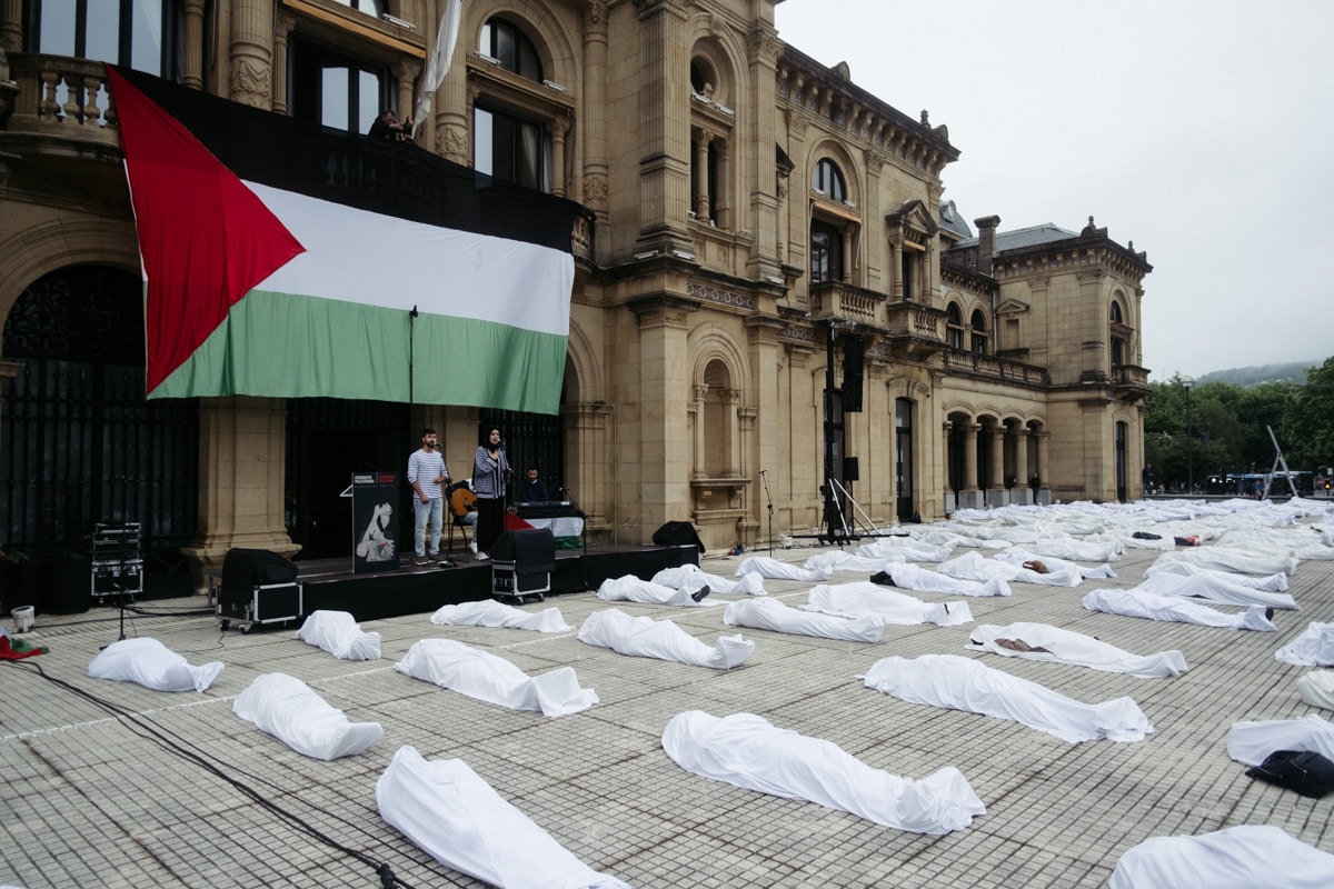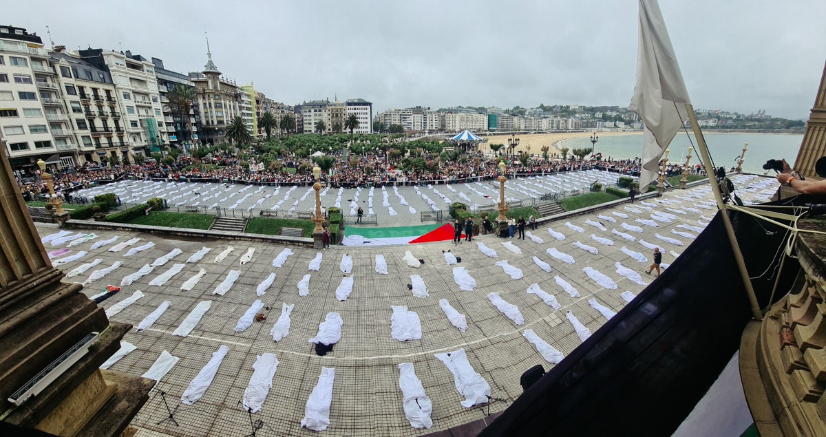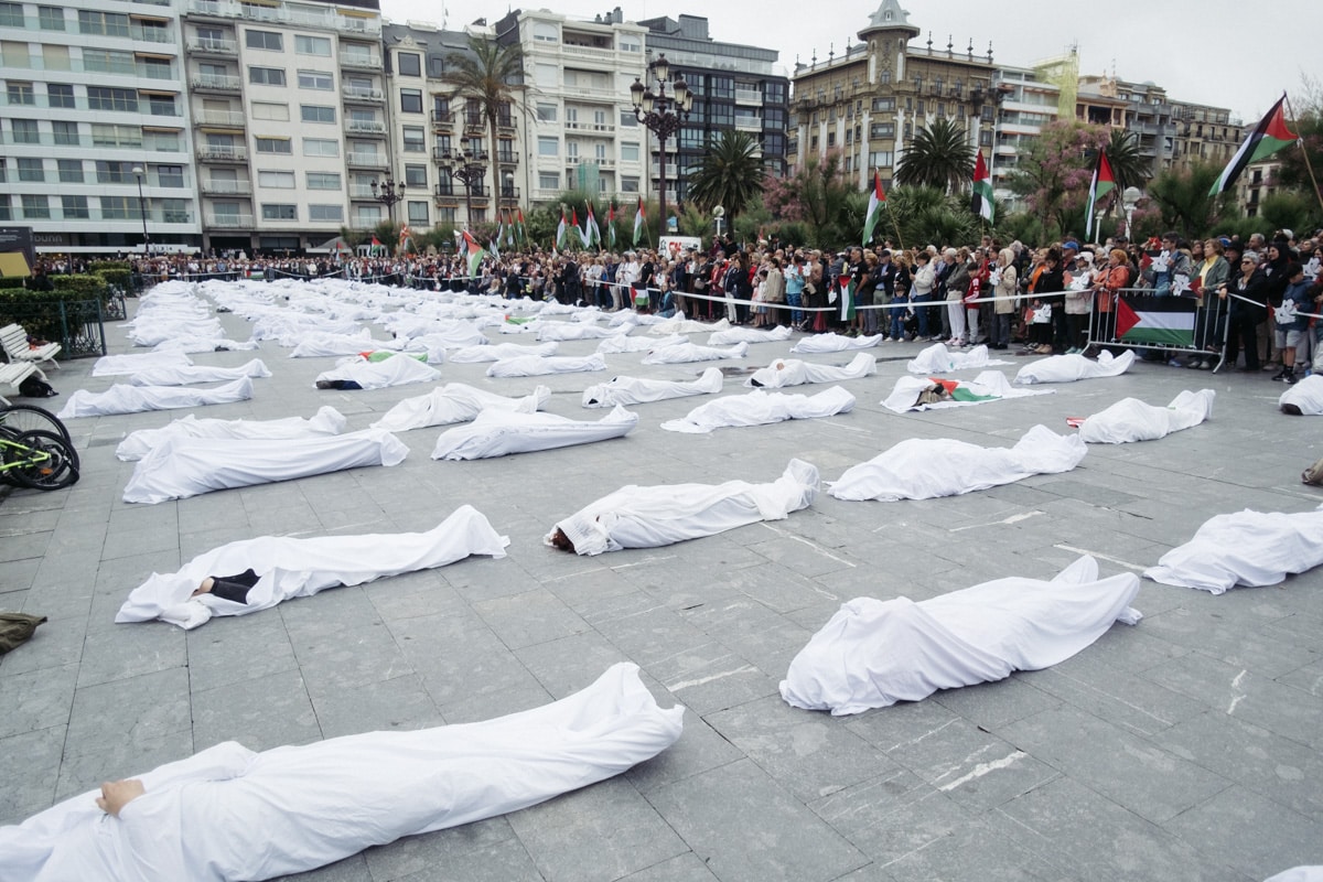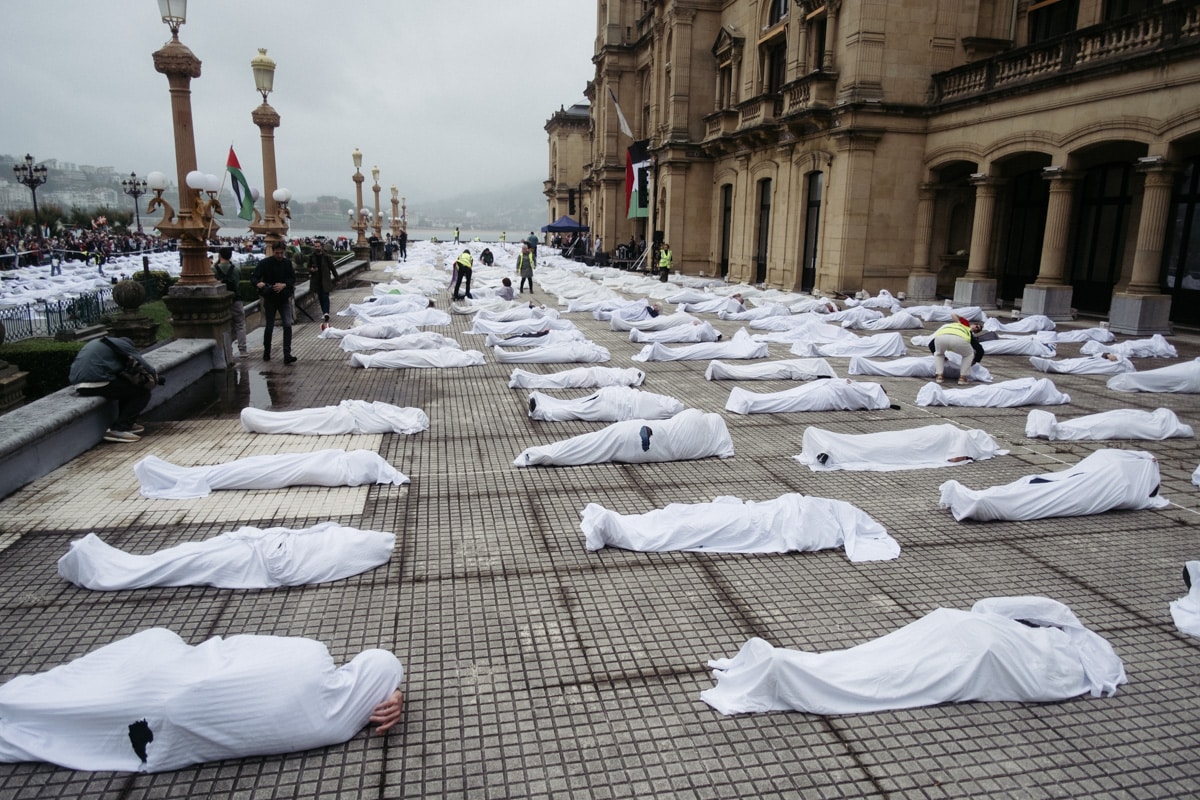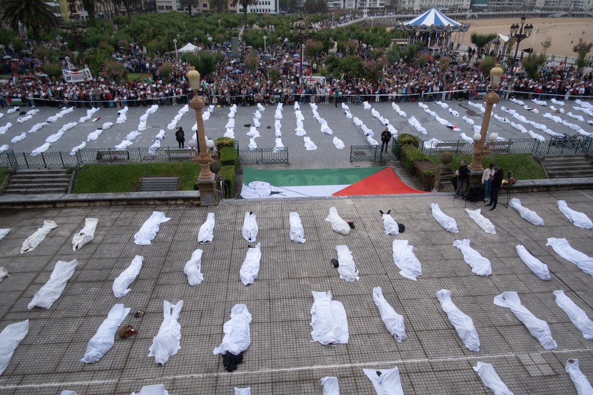 Alderdi Eder se ha convertido este mediodía en un clamor contra el genocidio en Gaza. La convocatoria de la plataforma Gernika-Palestina ha sido secundada por unas 2.000 personas que han presenciado una ‘performance’ en que medio millar de voluntarios, junto al Ayuntamiento donostiarra, han simulado una morgue.