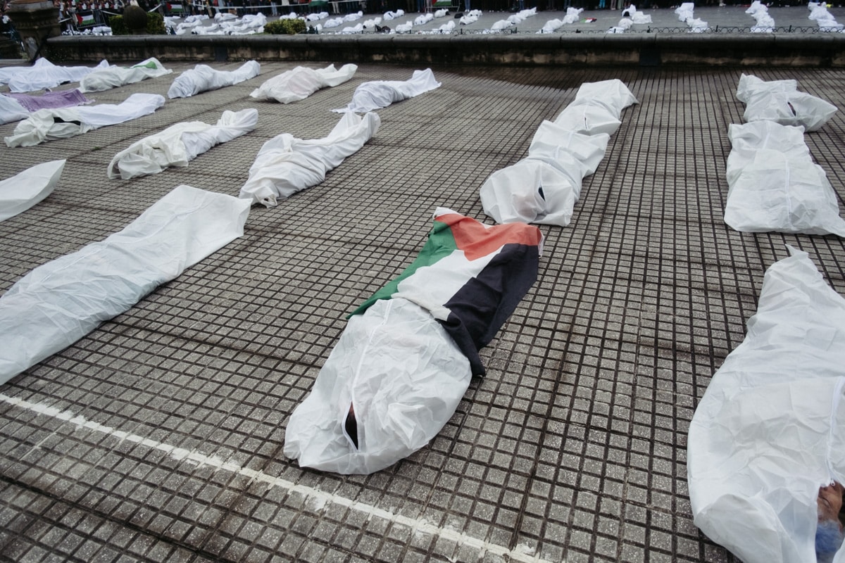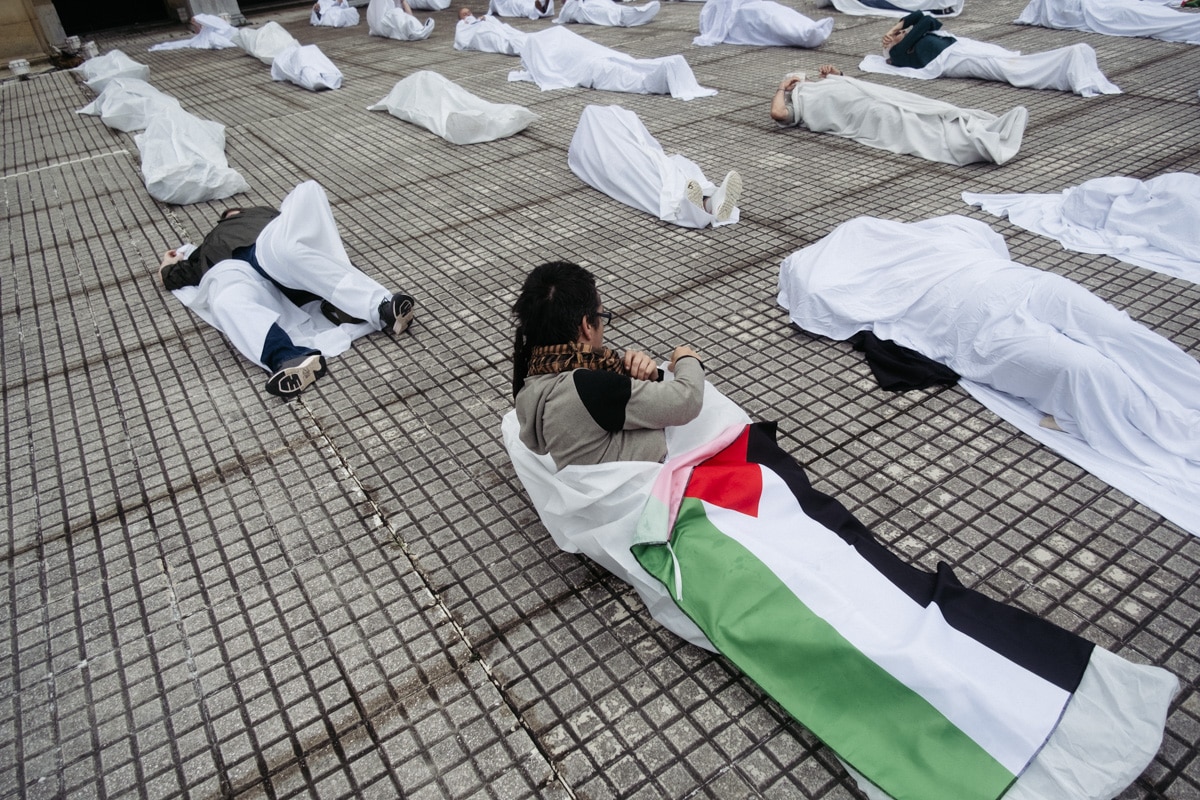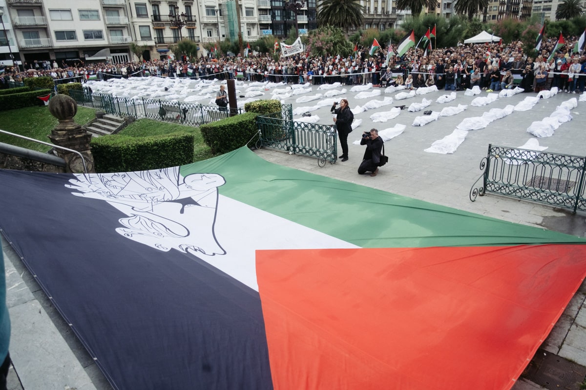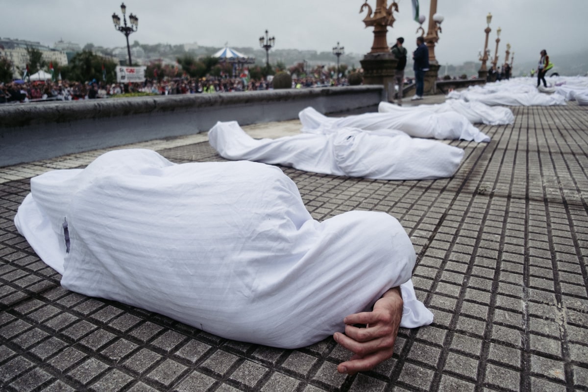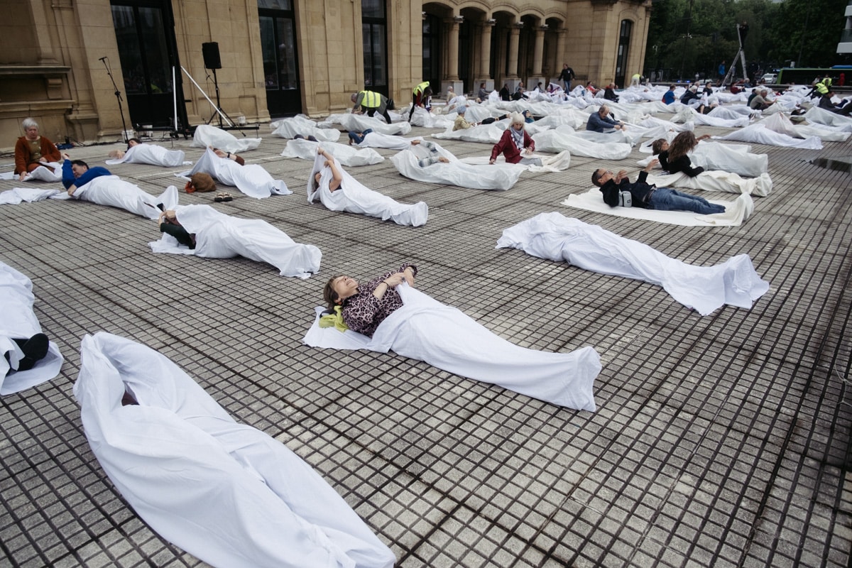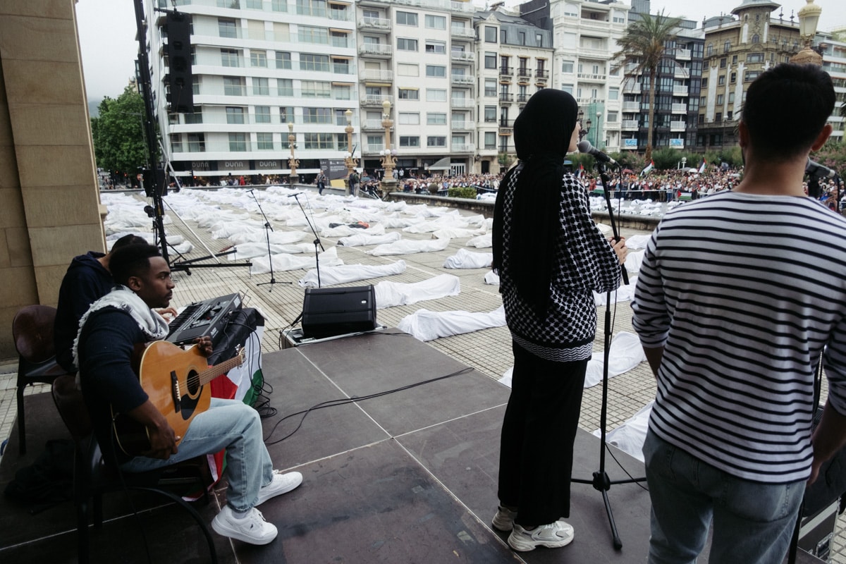 Alderdi Eder se ha convertido este mediodía en un clamor contra el genocidio en Gaza. La convocatoria de la plataforma Gernika-Palestina ha sido secundada por unas 2.000 personas que han presenciado una ‘performance’ en que medio millar de voluntarios, junto al Ayuntamiento donostiarra, han simulado una morgue.