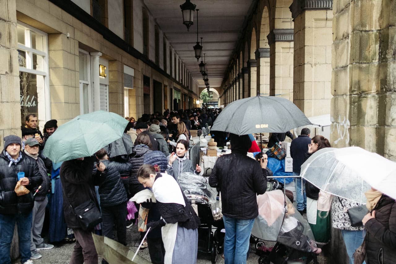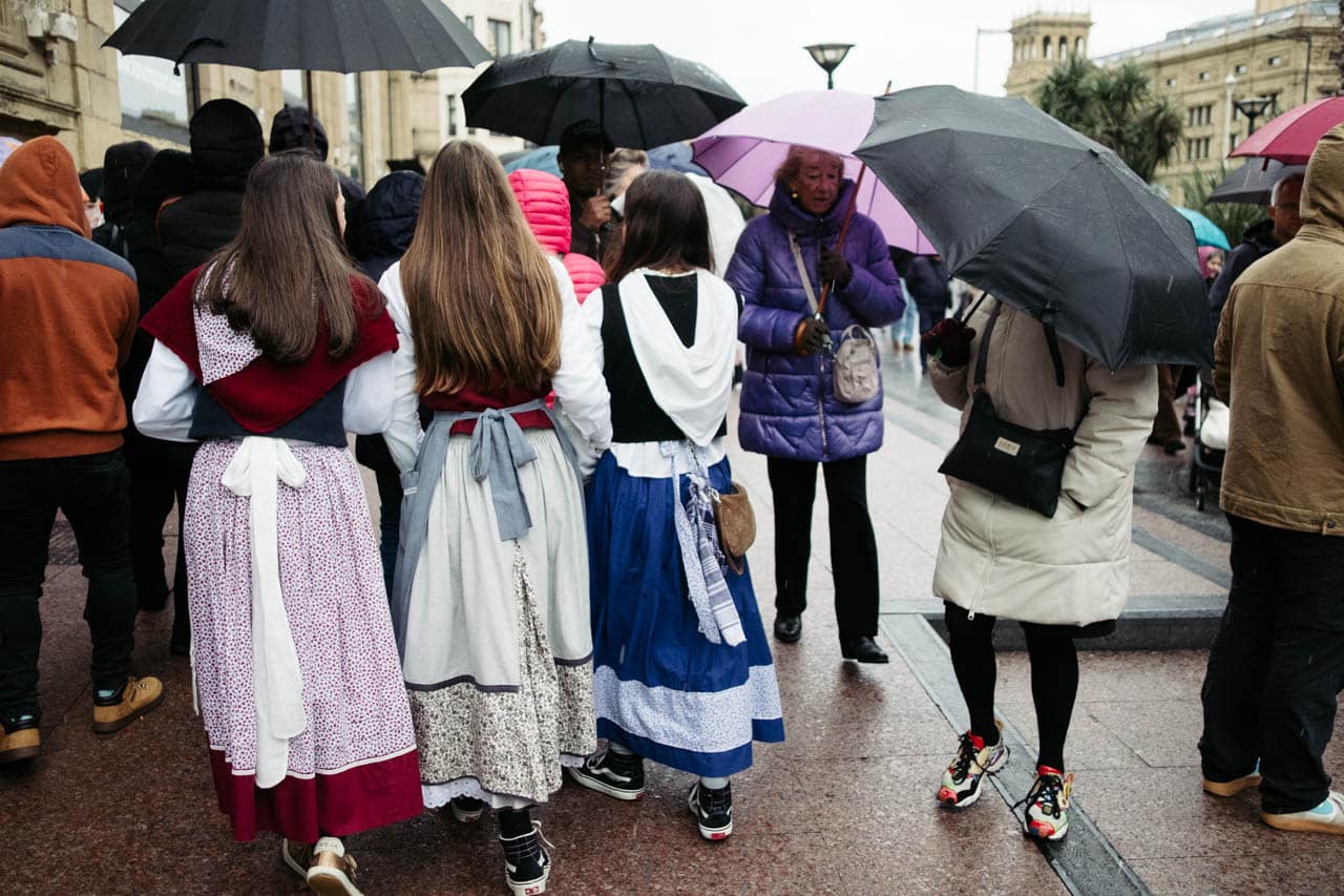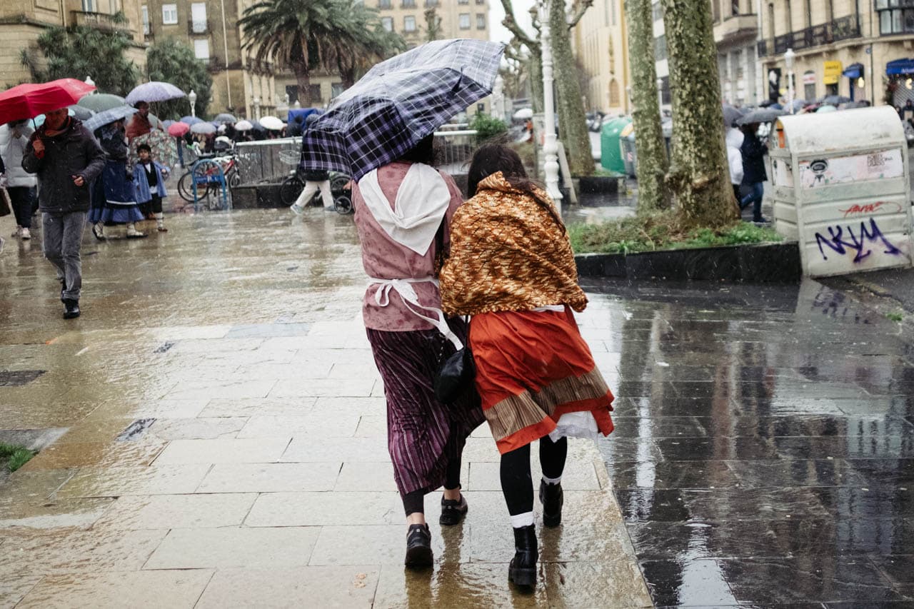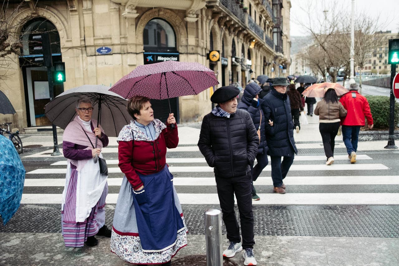 Aun así no faltaron a la cita los trajes de baserritarra, ni las txistorras, ni las largas colas que, incluso bajo la lluvia, siguieron marcando el pulso de la fiesta. Además por la tarde mejoró el panorama: llovío mucho menos, pero se notó más el frío. Pese a todo la mayoría de la ciudadanía donostiarra estuvo en las calles.
