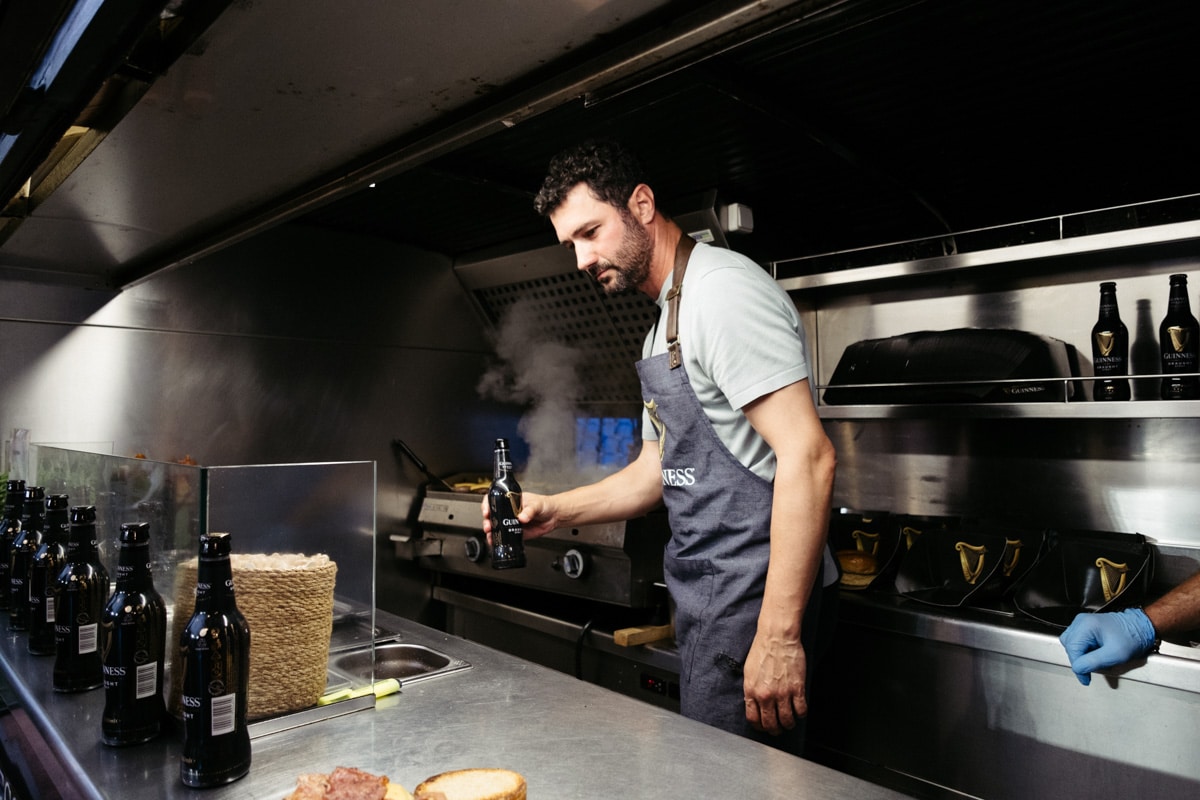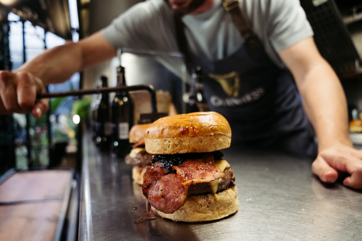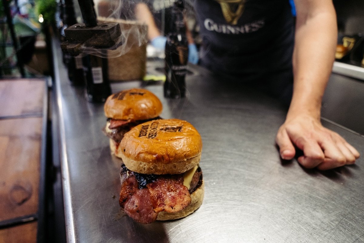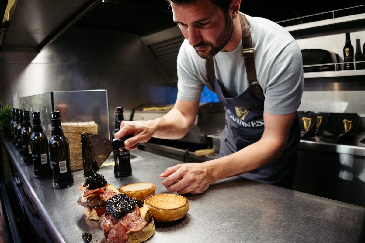 Con motivo de la inauguración se ha presentado este viernes la Guinness Burger. Un nuevo concepto de hamburguesa gourmet con la icónica cerveza negra como ingrediente inédito, creada por Eneko Fernández, ganador del programa MasterChef 11.