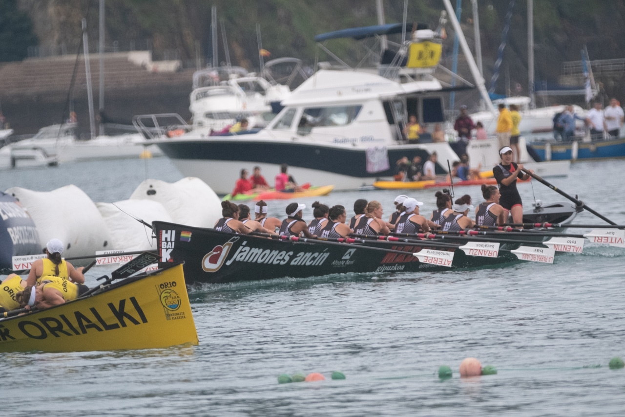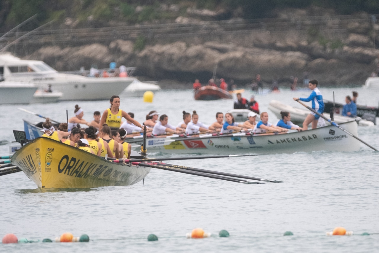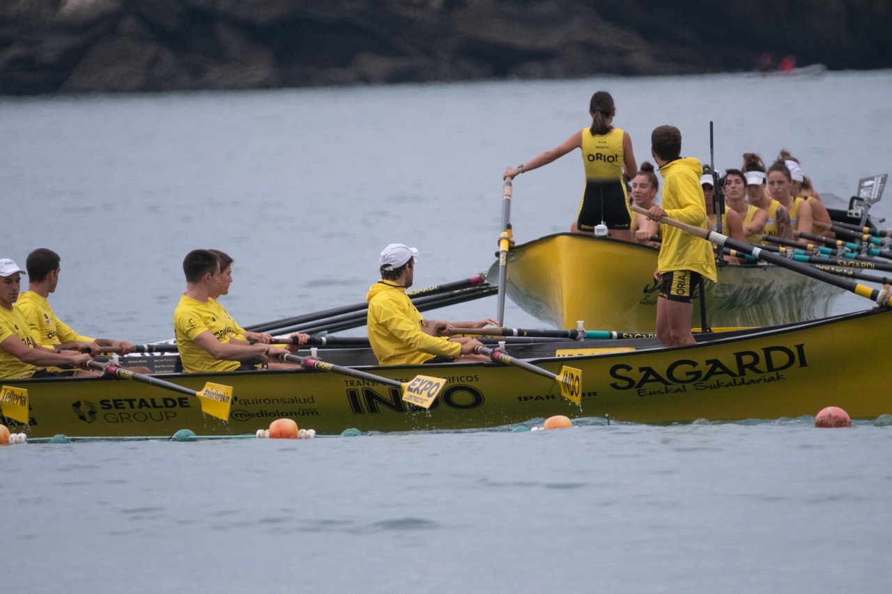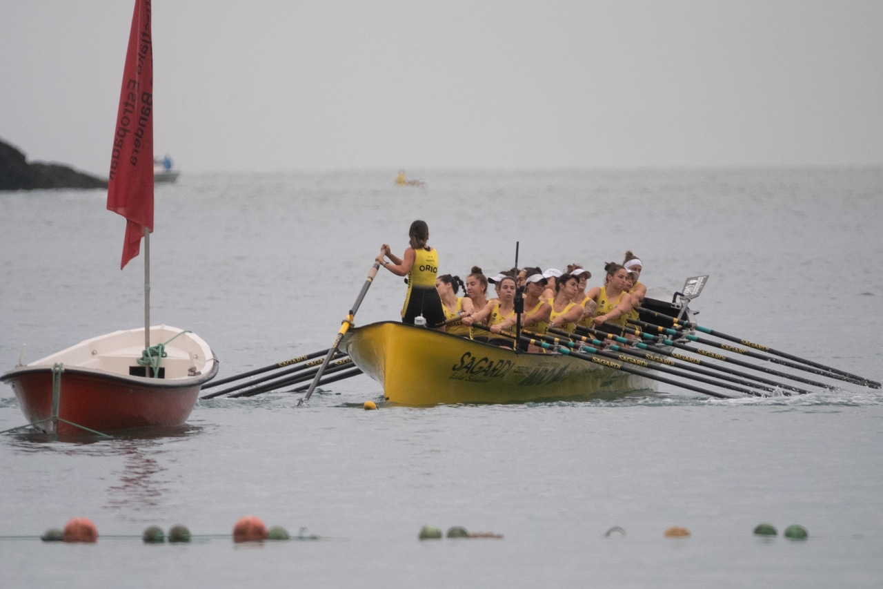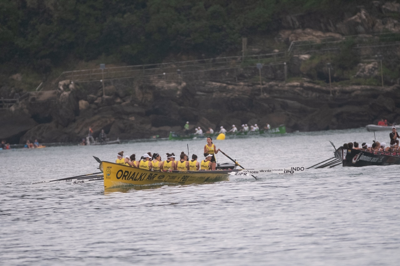 Palada a palada las remeras oriotarras fueron haciendo brecha, a mitad de prueba solo Hibaika seguía de lejos su estela, y el bote amarillo se concentró, sobre una buena mar para las regatas, en intentar un crono insuperable para las embarcaciones que seguidamente bogarían en la segunda de las tandas, algo que no logró aunque estuvo cerca.