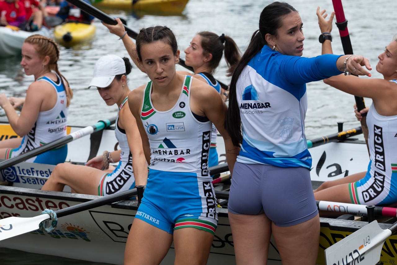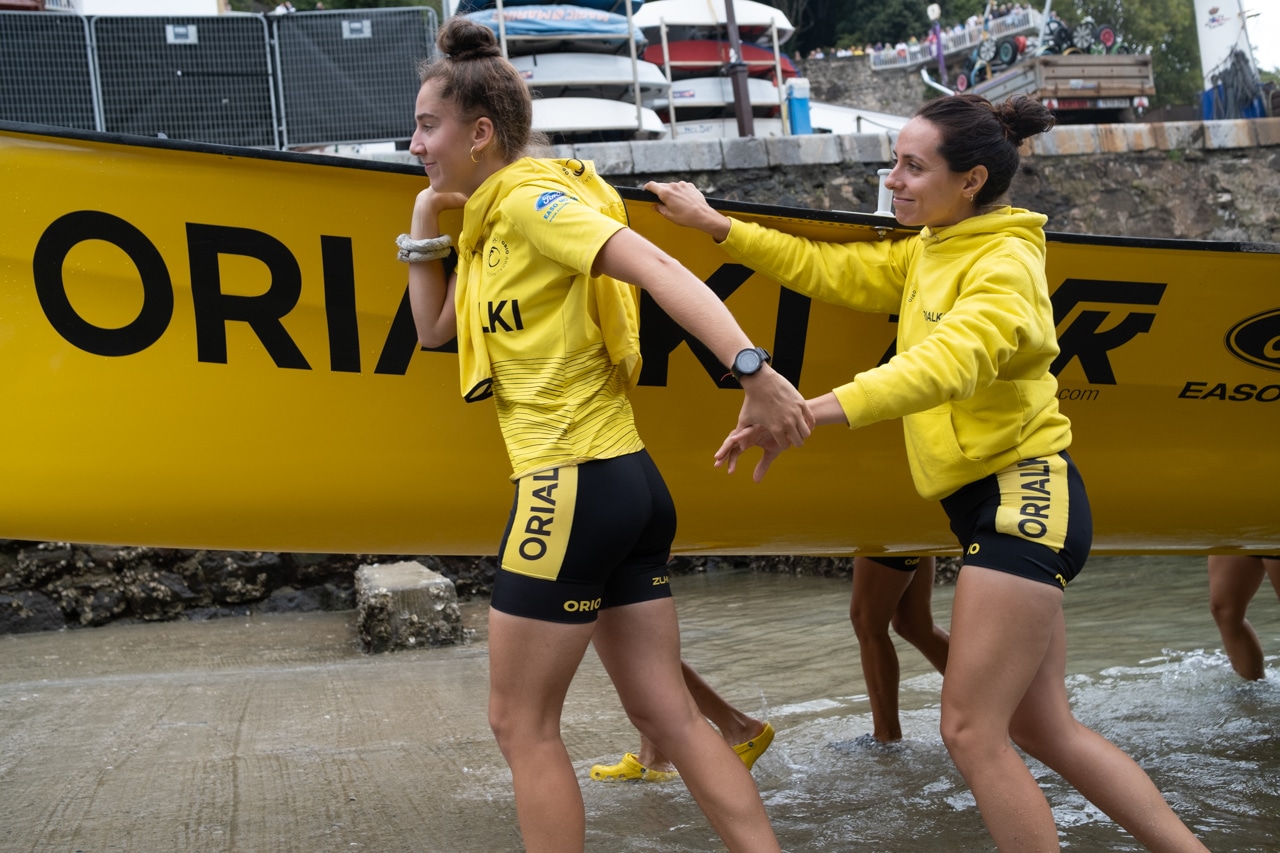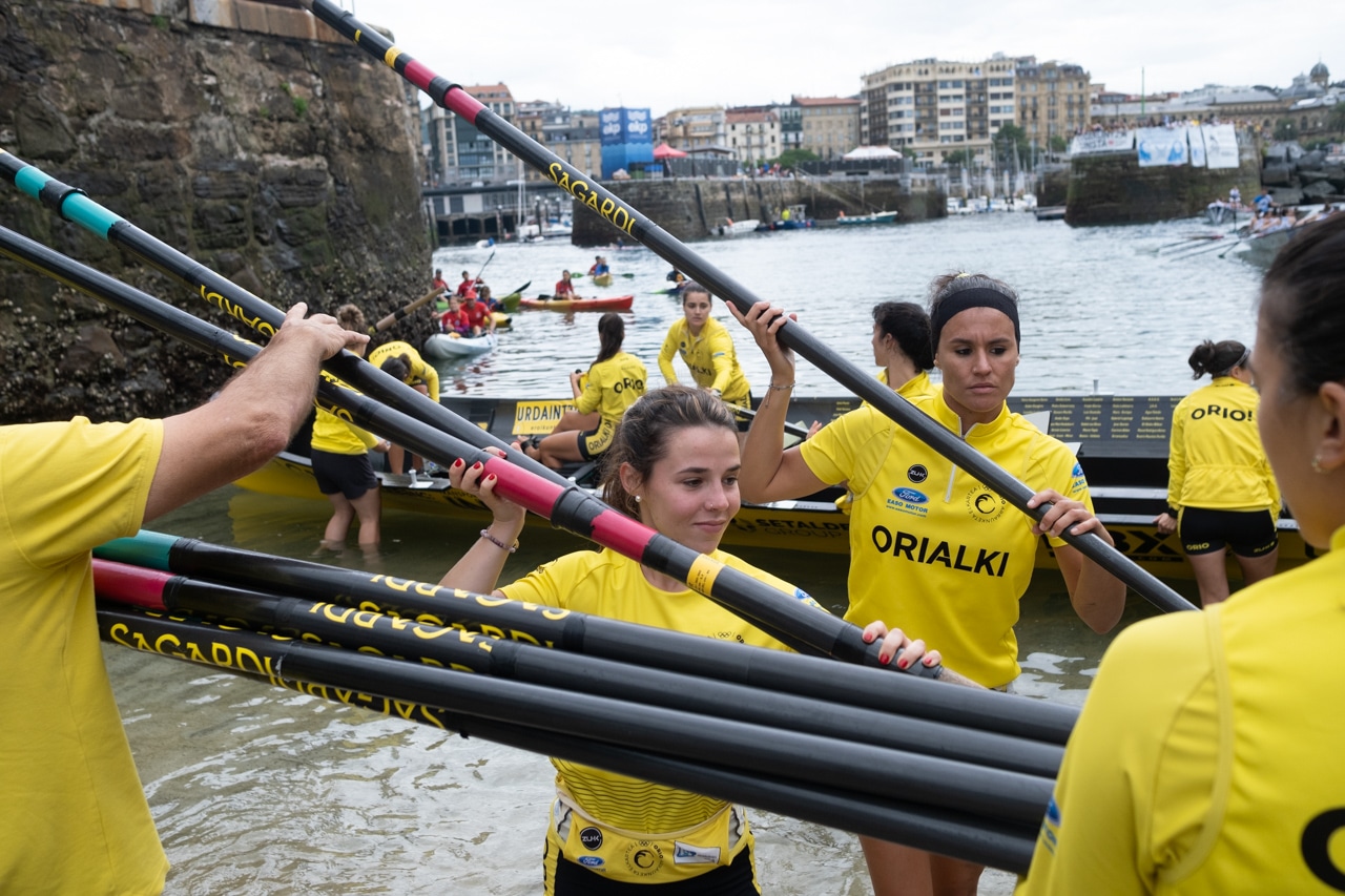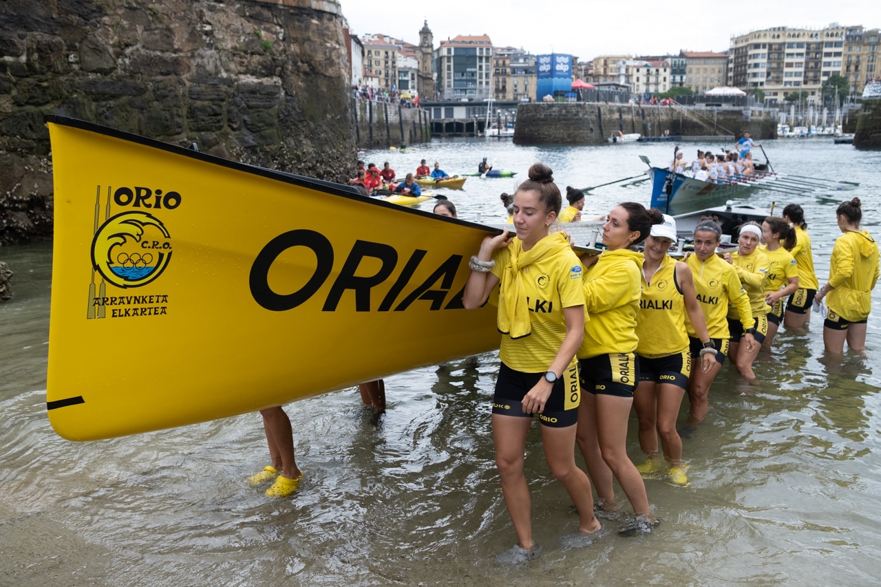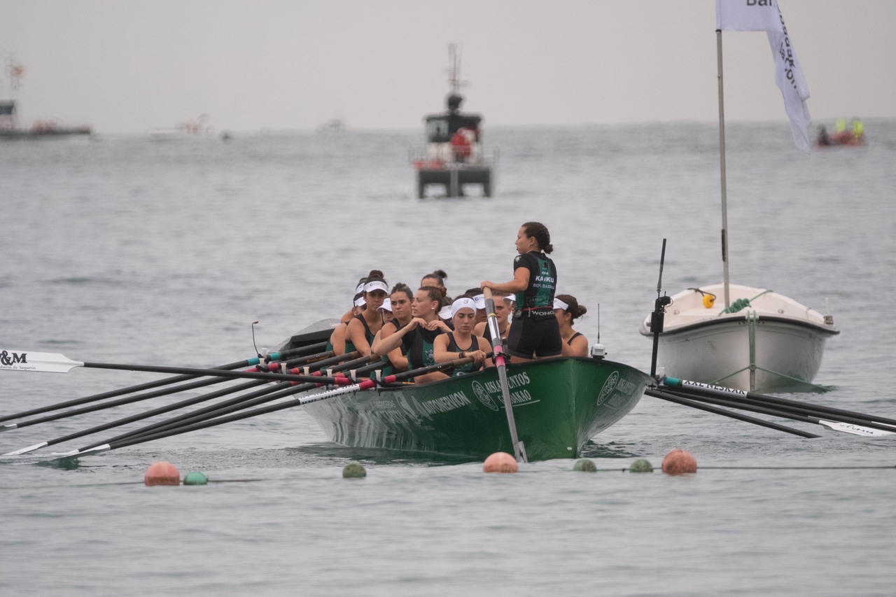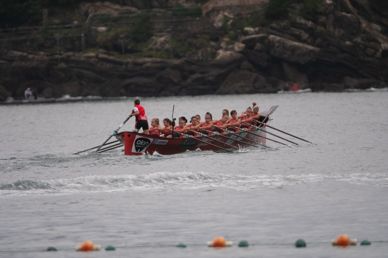 Palada a palada las remeras oriotarras fueron haciendo brecha, a mitad de prueba solo Hibaika seguía de lejos su estela, y el bote amarillo se concentró, sobre una buena mar para las regatas, en intentar un crono insuperable para las embarcaciones que seguidamente bogarían en la segunda de las tandas, algo que no logró aunque estuvo cerca.