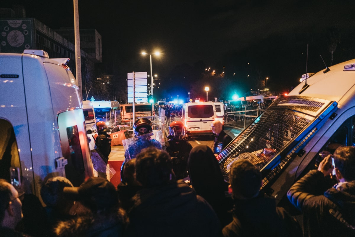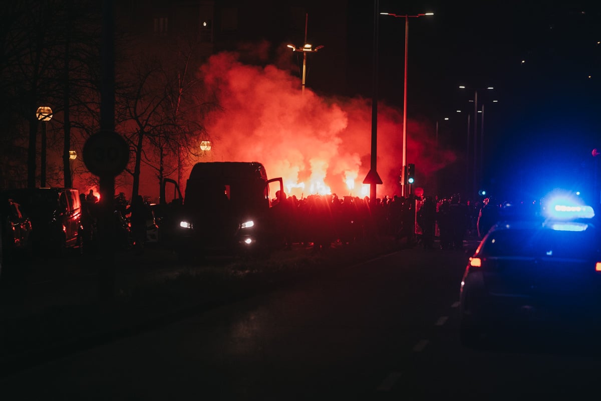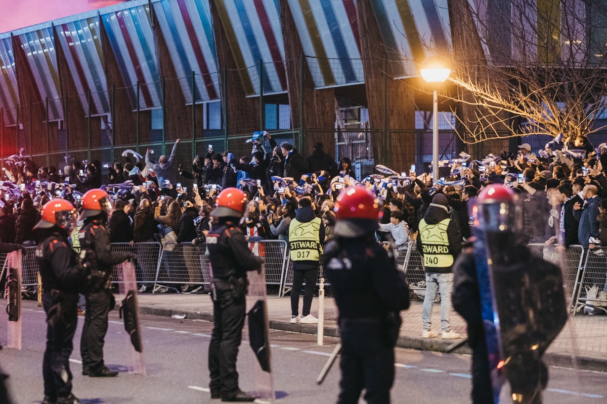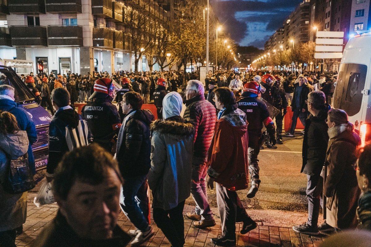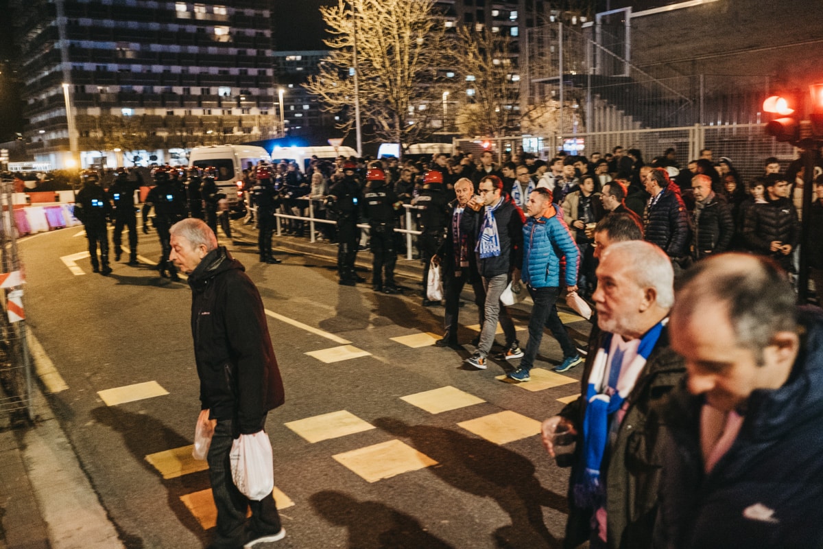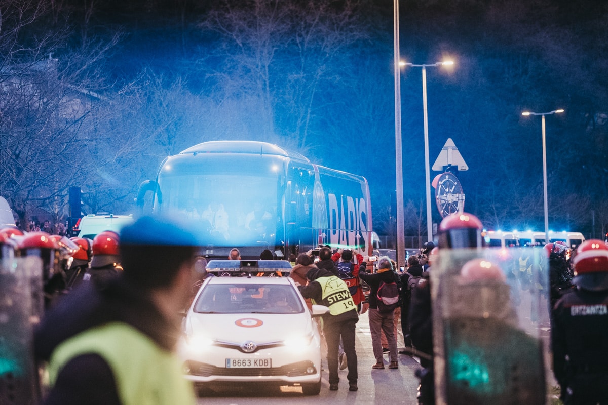 Escoltado entre grandes medidas de seguridad y portando bengalas, el grueso de los aficionados del Paris Saint Germain ha recorrido esta tarde de martes el trayecto desde Alderdi Eder hasta el Reale Arena, a donde ha llegado sobre las 20 horas, y donde Real Sociedad y PSG han comenzado el enfrentamiento a las 21 horas. Antes de eso miles de personas se han congregado en Anoeta para recibir a los autobuses de ambos equipos.