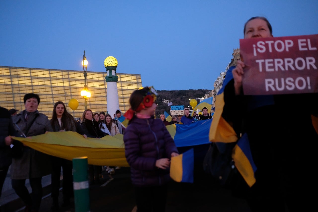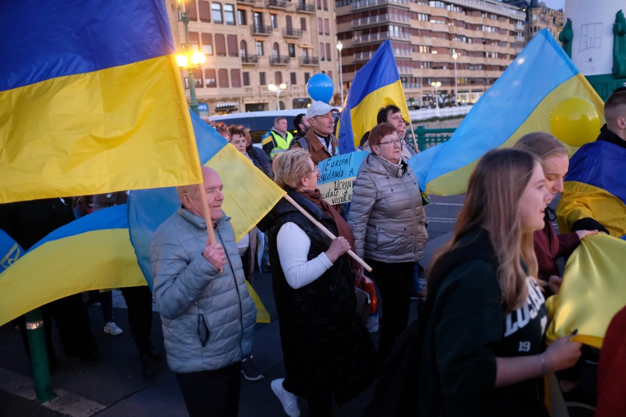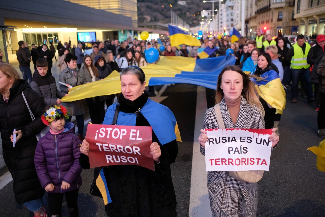 Donostia ha vuelto a solidarizarse con Ucrania, hoy, y cientos de personas han participado en la marcha con motivo del primer aniversario de la invasión rusa. Con banderas, carteles y pancartas la comitiva ha partido del Kursaal a las 19 horas en dirección a la plaza Gipuzkoa.