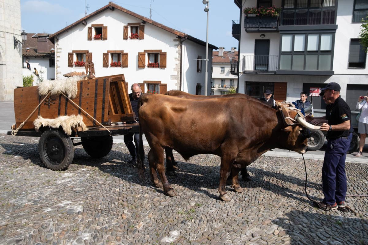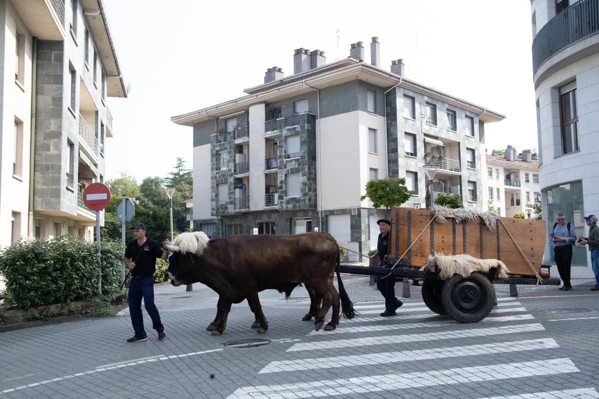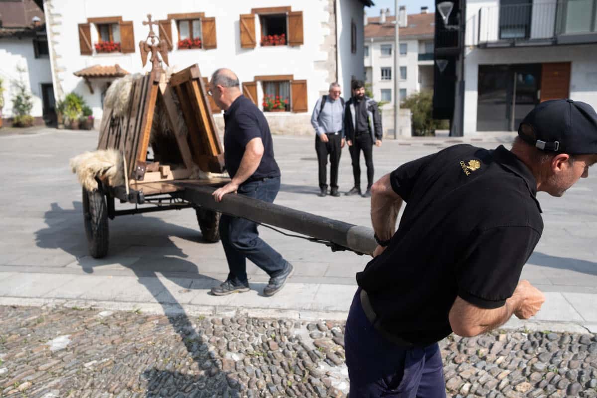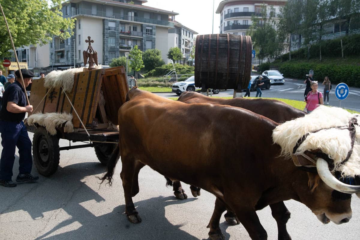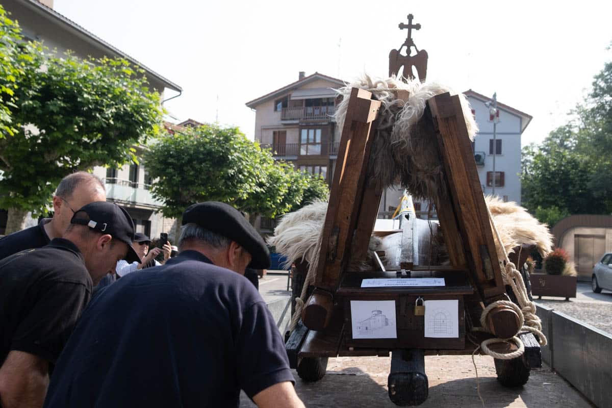 Una carreta tirada por bueyes partió este lunes desde Albaola, en Pasaia, rumbo al Santuario de San Miguel de Aralar, cargada con las réplicas de las puertas quemadas del templo, que fueron destruidas en un ataque el pasado octubre. Las imágenes son del paso hoy por Astigarraga.