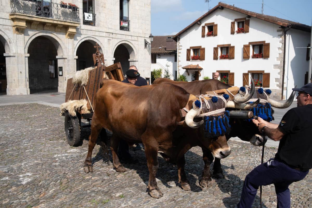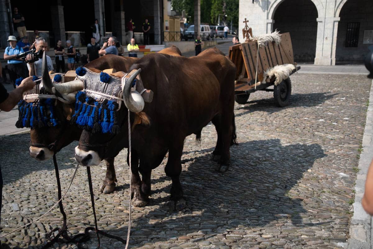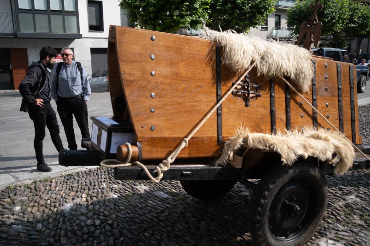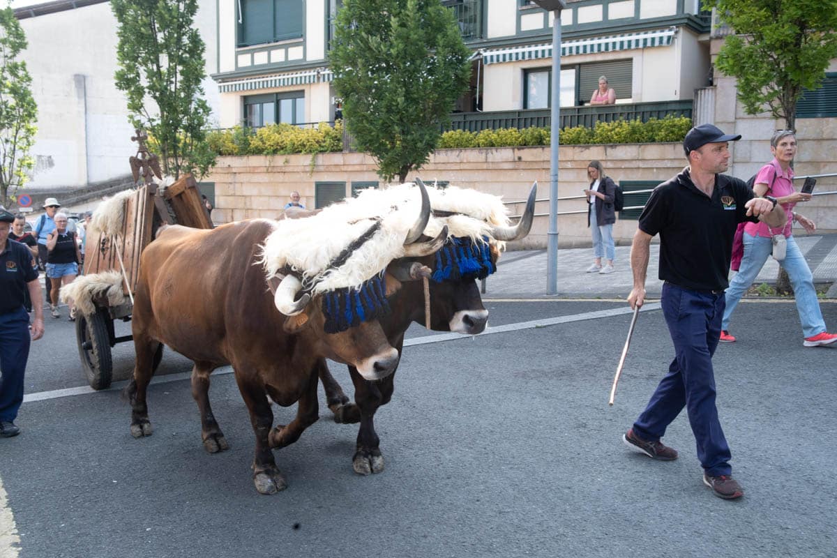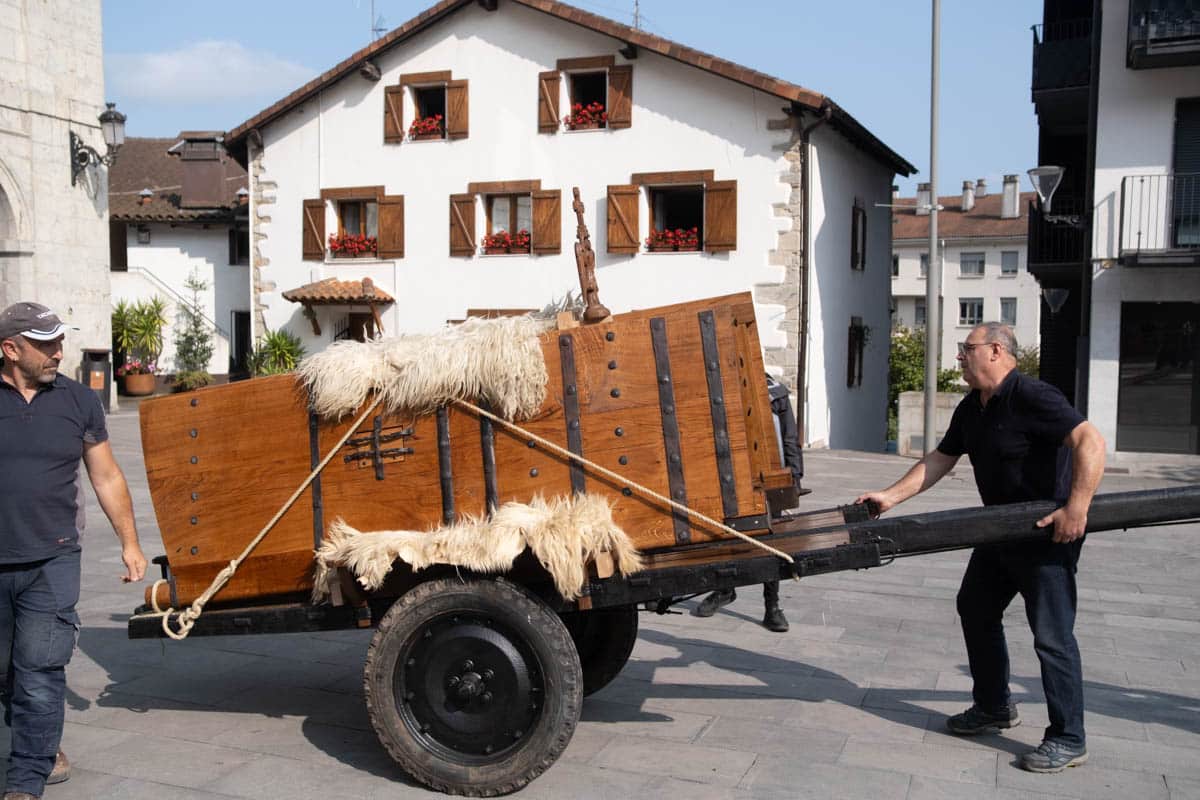 Una carreta tirada por bueyes partió este lunes desde Albaola, en Pasaia, rumbo al Santuario de San Miguel de Aralar, cargada con las réplicas de las puertas quemadas del templo, que fueron destruidas en un ataque el pasado octubre. Las imágenes son del paso hoy por Astigarraga.