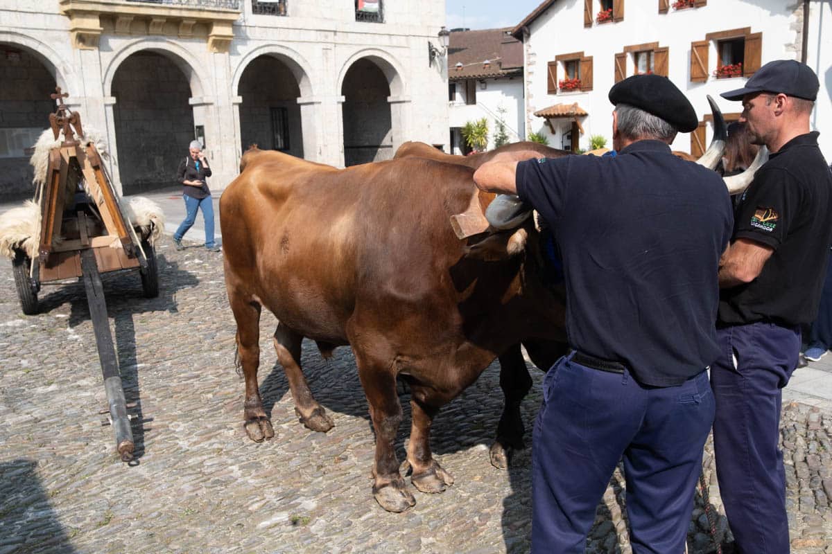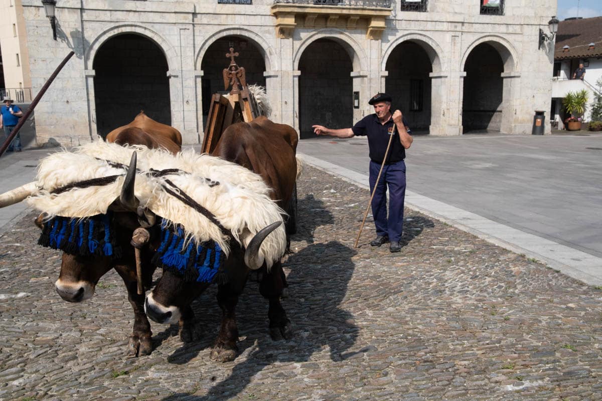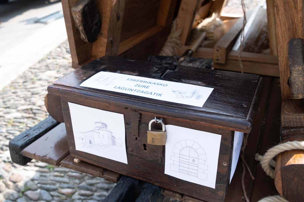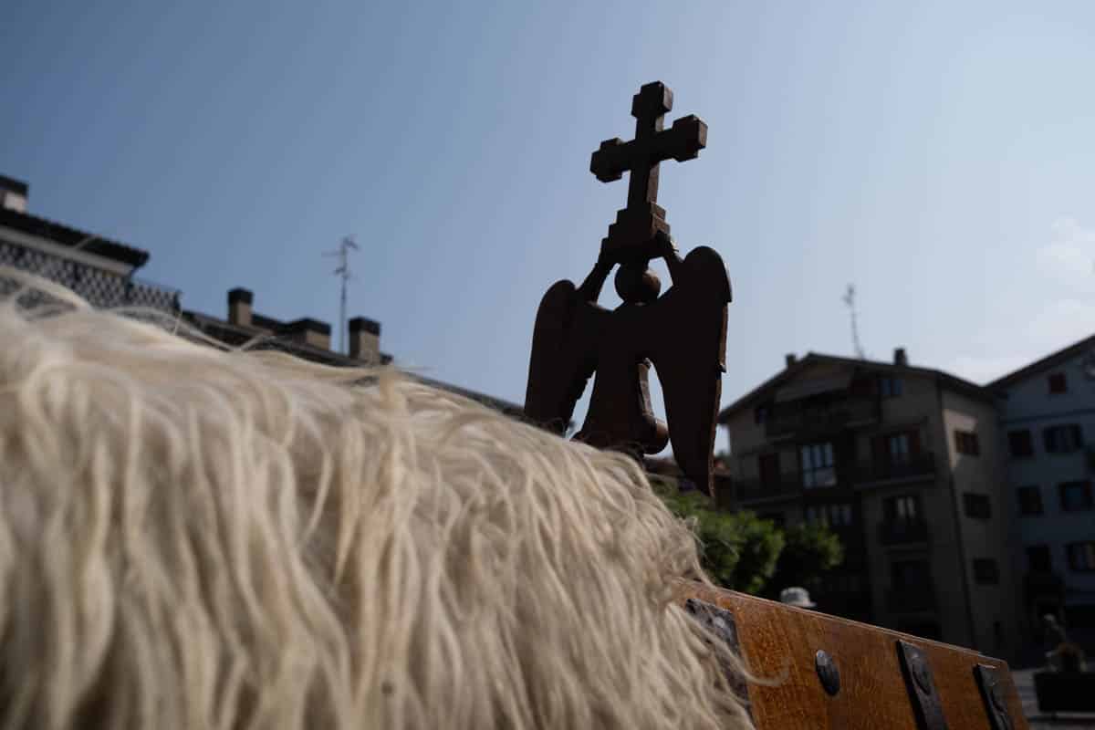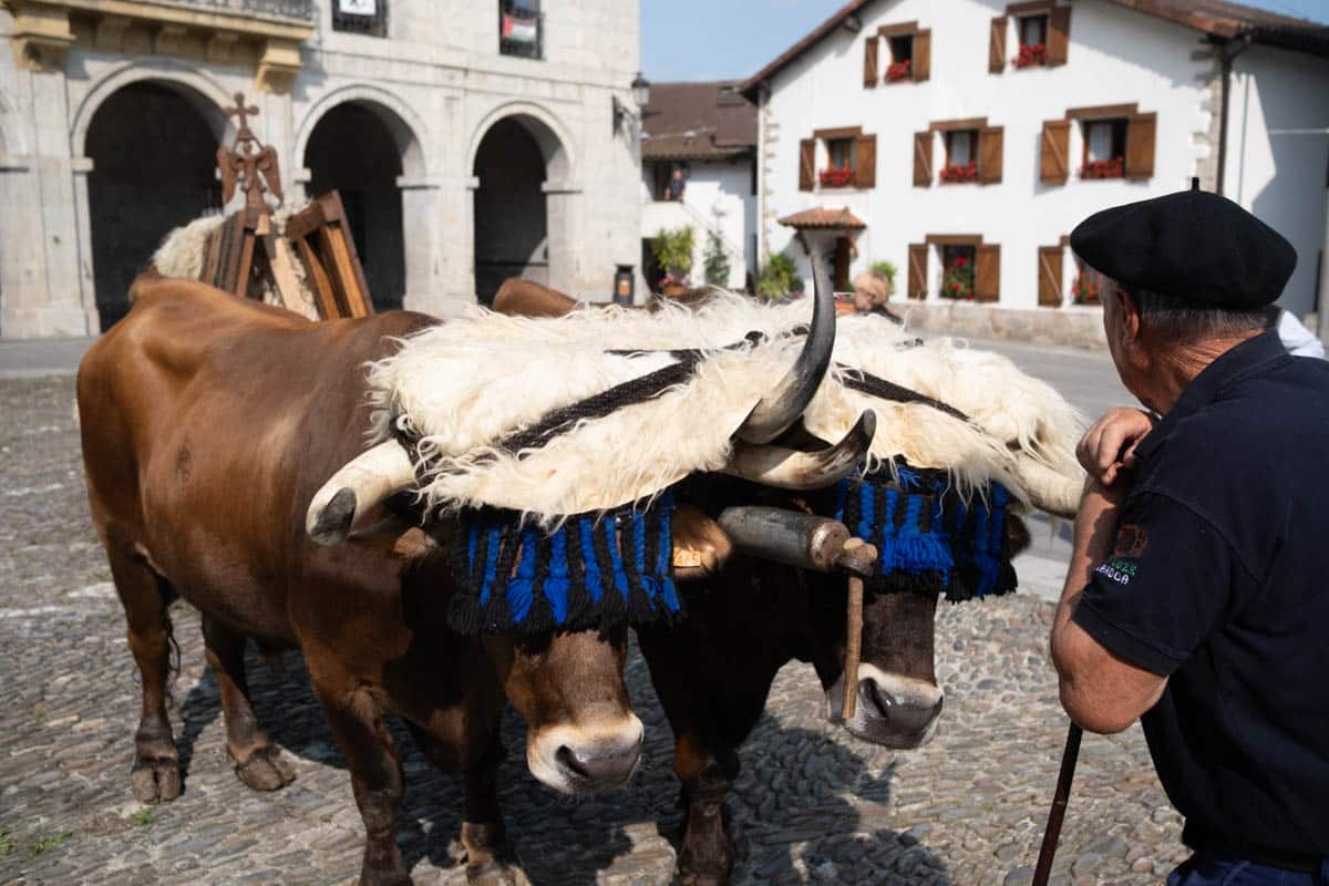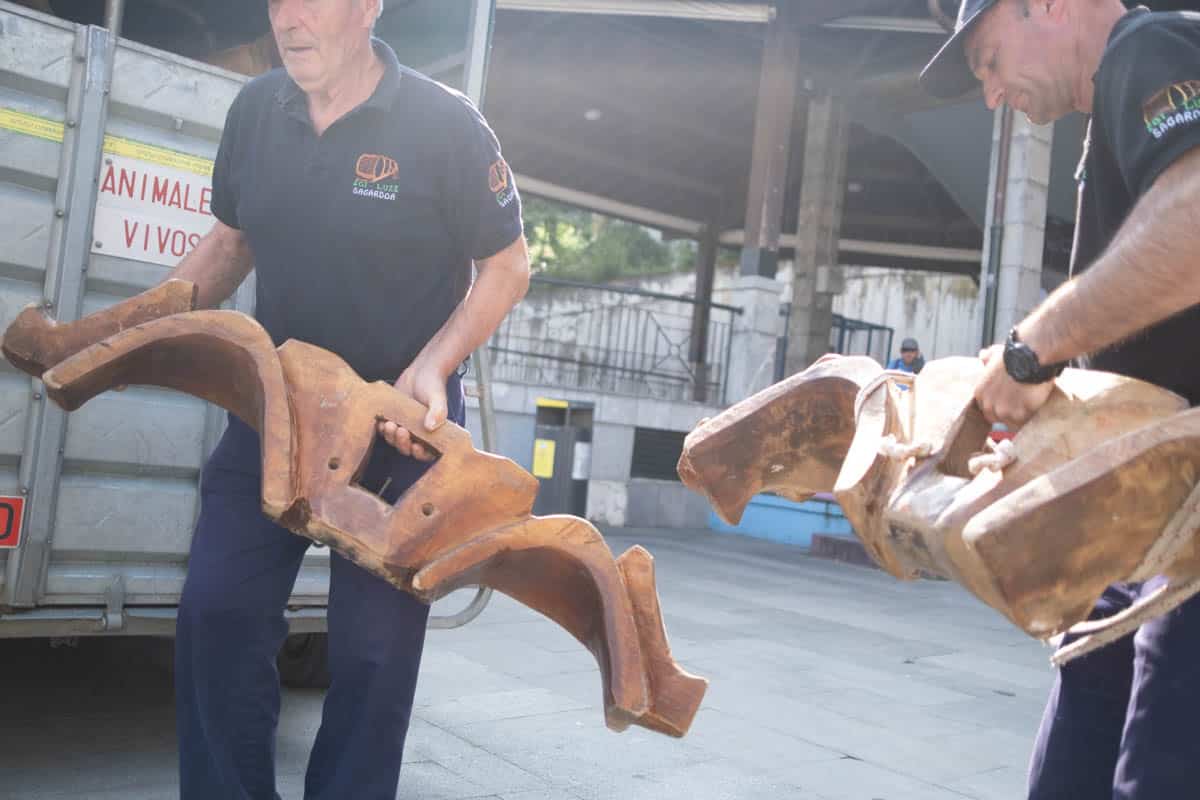 Una carreta tirada por bueyes partió este lunes desde Albaola, en Pasaia, rumbo al Santuario de San Miguel de Aralar, cargada con las réplicas de las puertas quemadas del templo, que fueron destruidas en un ataque el pasado octubre. Las imágenes son del paso hoy por Astigarraga.