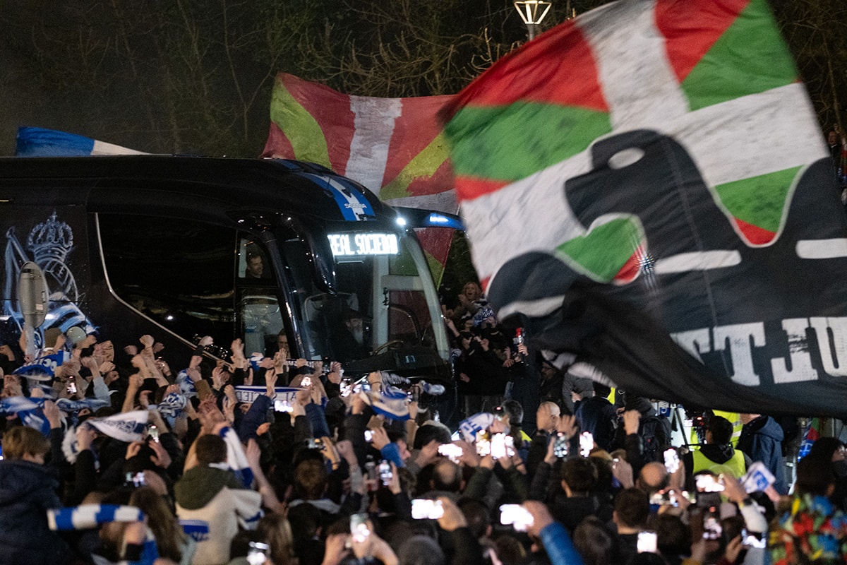 El autocar txuriurdin estrenó itinerario este miércoles, tal y como estaba anunciado, con motivo del partido contra el Real Madrid. Cientos de aficionados estaban a la espera en Anoeta cuando los jugadores de la Real Sociedad llegaron para disputar el partido de ida de la semifinales de la Copa del Rey. La vuelta será en el Bernabéu.