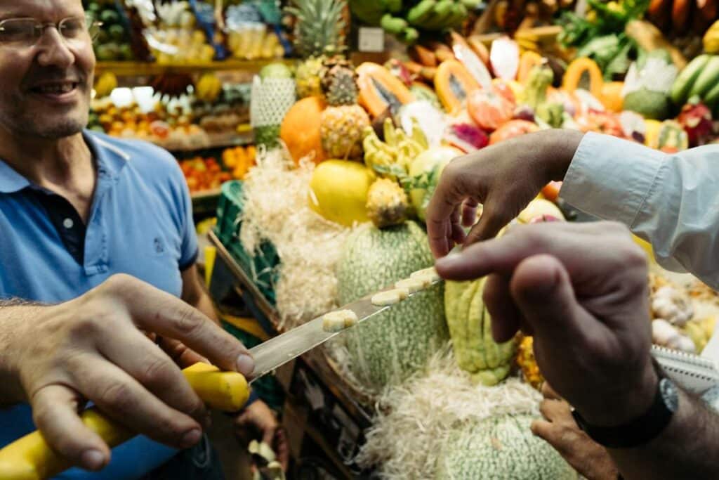 José, un frutero del mercado, nos ha ofrecido una degustación de plátanos en la que he descubierto que no sólo existe el «plátano normal» sino toda una variedad, unos rojos, otros que se pueden comer con piel e incluso unos que se cortan en un extremo y se presiona para extraer la pulpa.