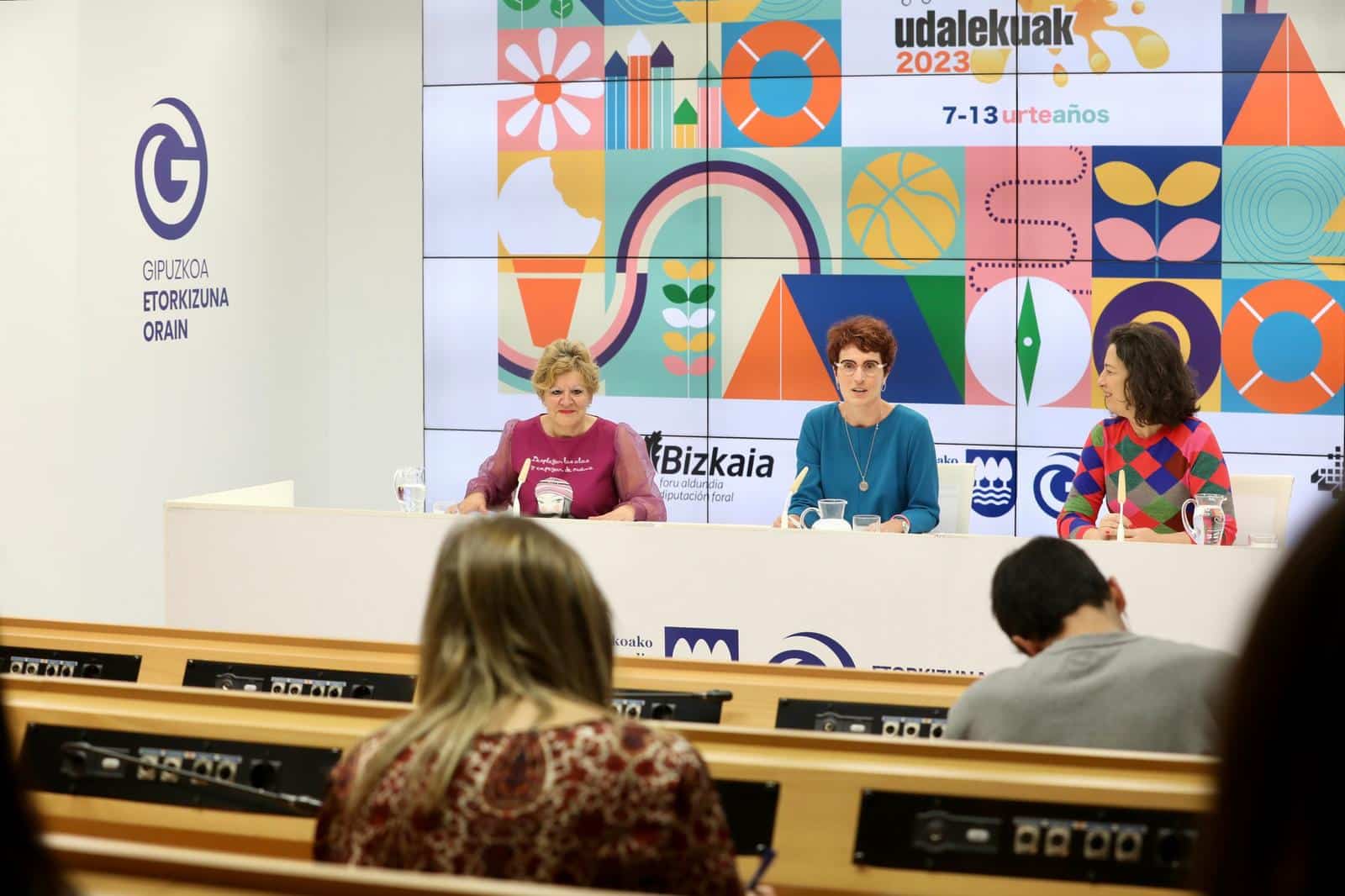 La diputada de Cultura y Juventud, María José Telleria, ha presentado esta mañana en el Palacio Foral el programa Udalekuak 2023. Lo ha hecho acompañada de Lorea Bilbao, diputada de Euskera, Cultura y Deporte de Bizkaia, y Ana del Val, diputada de Cultura y Deporte de Álava.
