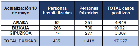 Son 17.677 positivos en Euskadi a día de hoy, aunque 14.646 personas ya está dada de alta (casi el 83%). En Gipuzkoa se ha pasado la barrera de los 3.000 y son 3.007 los residentes que han estado contagiados en algún momento desde el inicio de la epidemia (735 en Donostia). 277 personas han fallecido (dos más que ayer) y están ingresadas 77.