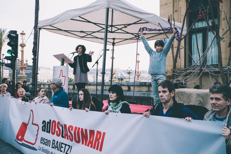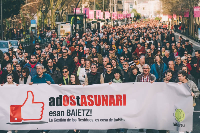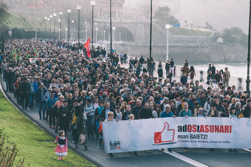 «Los ciudadanos piden un sistema de gestión de residuos que no afecte a la salud, que se aprovechen las instalaciones ya construidas y que sea económicamente viable», han expresado los representantes de GuraSOS al término de la marcha y sobre un escenario situado en el lateral del Ayuntamiento donostiarra. «Así que hemos presentado un plan técnico alternativo», han continuado, añadiendo que aceptan algunas de las propuestas institucionales en materia de gestión de residuos, «pero no la incineración». En este punto los miles de manifestantes han coreado en contra de la incineración.