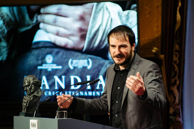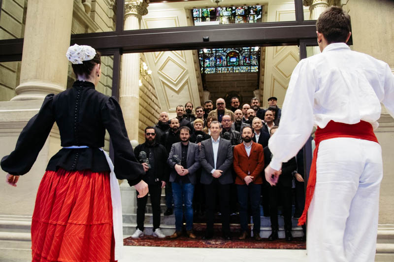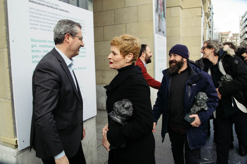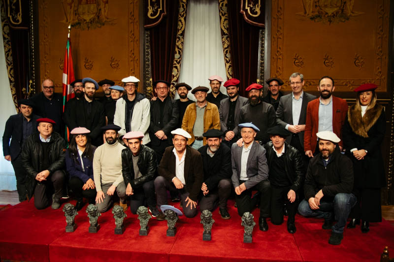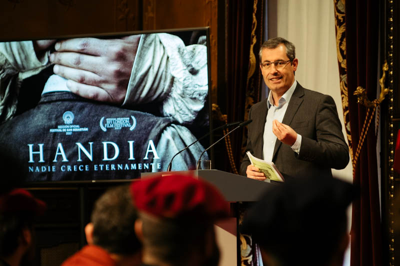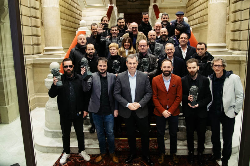 No se quejará el equipo de ‘Handia’ del recibimiento que le dan en casa. Desde el sábado, tras hacer propios diez de los premios Goya a los que estaban nominados, transitan los artífices de la película por un mar de felicitaciones. «Todavía estamos en una nube», ha expresado uno de los directores, Aitor Arregi. Hoy parte importante del equipo, unas veinte personas, han sido recibidas por el diputado general Markel Olano y el diputado de Cultura Denis Itxaso. Allí, en la Diputación, el productor Xabier Berzosa ha agradecido al ente foral su apoyo desde el inicio del proyecto.
