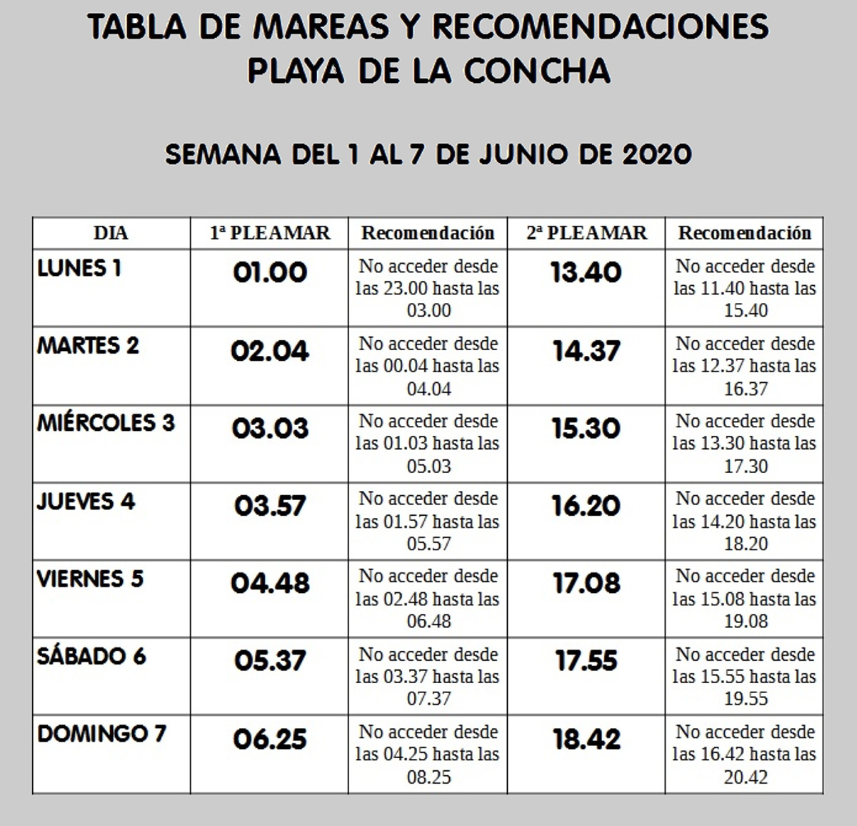 Semana 1 Junio Horarios de acceso a la playa de la Concha (1-7 junio)