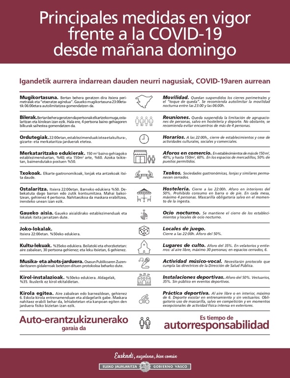 El nuevo decreto entrará en vigor el domingo y establece un marco regulador sobre el horario de la actividad cultural, social, hostelera o comercial (hasta las 22 horas). Como era previsible tras la decisión del TSJPV el decreto no contempla ni la limitación a la movilidad nocturna, la restricción específica a agrupaciones de personas, ni cierre perimetral de la CAPV o municipios.