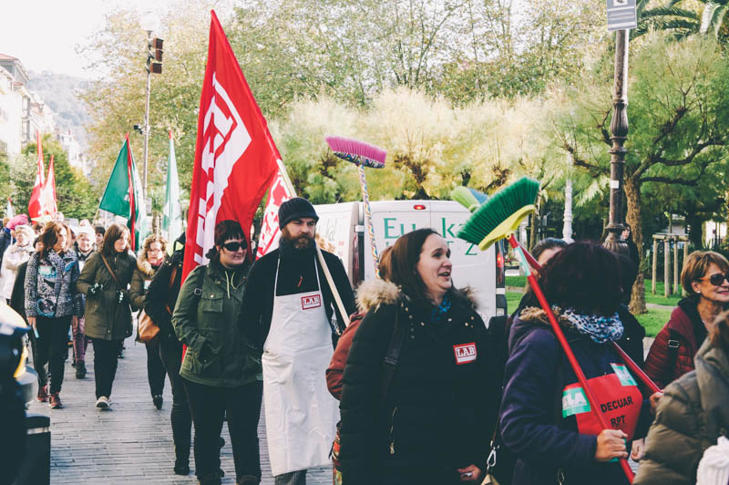 En la protesta organizada por ELA y LAB han denunciado que de la totalidad de la plantilla el 63% tiene un contrato temporal (más de 400 trabajadores), que mientras muchos puestos estructurales son de jornada parcial más de 2.420 horas de trabajo se contratan a través de los denominados contratos de apoyo, las cargas de trabajo han aumentado mucho, no se realizan sustituciones o se hacen muy tarde y el sector ha sufrido una pérdida del poder adquisitivo del 11%, lo que supone 1.600 euros desde 2010.