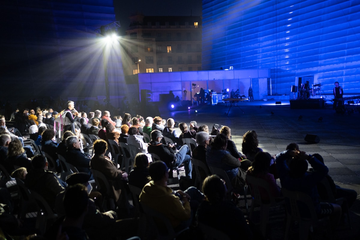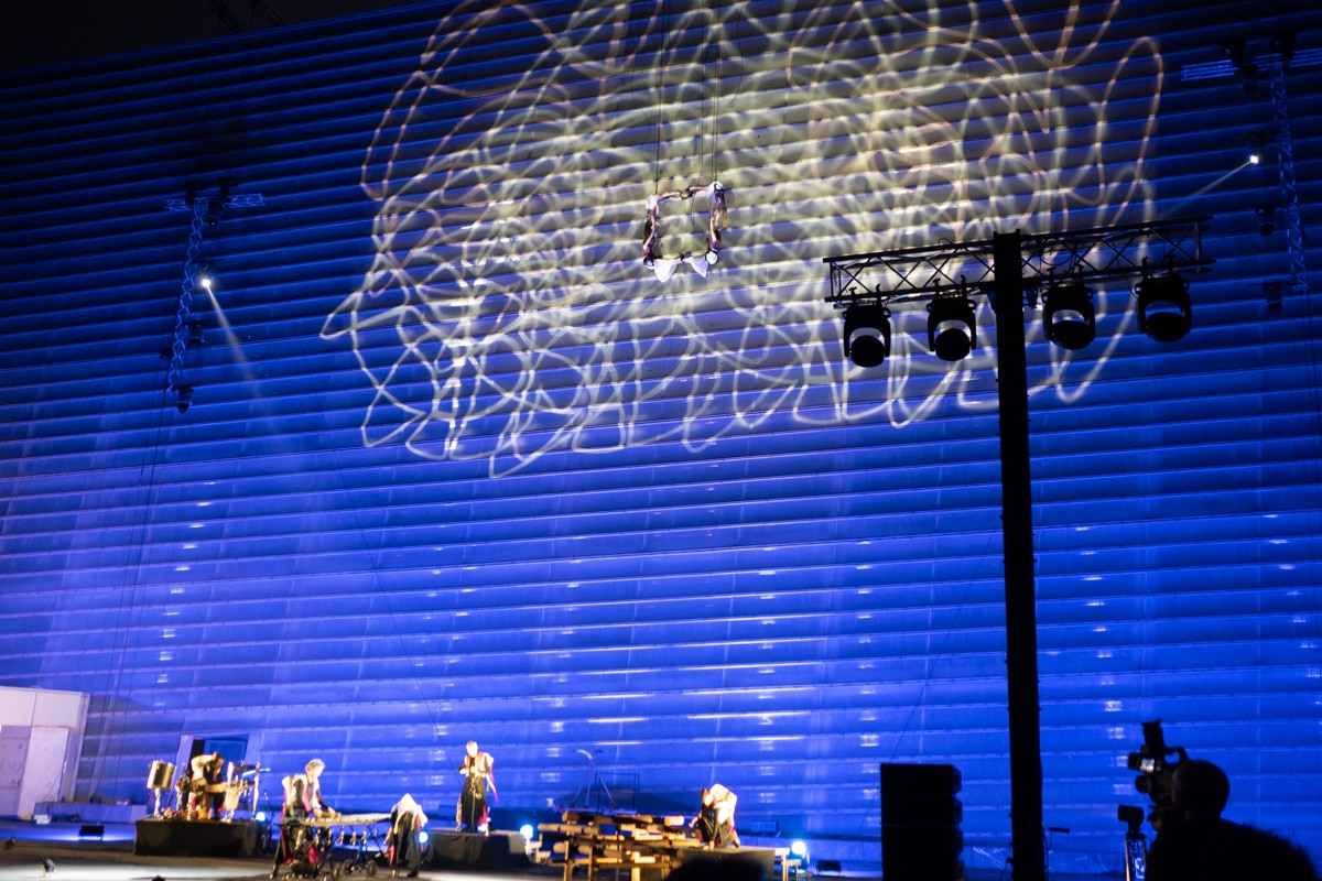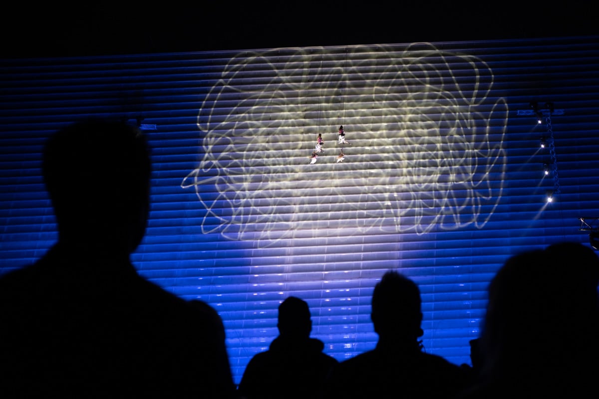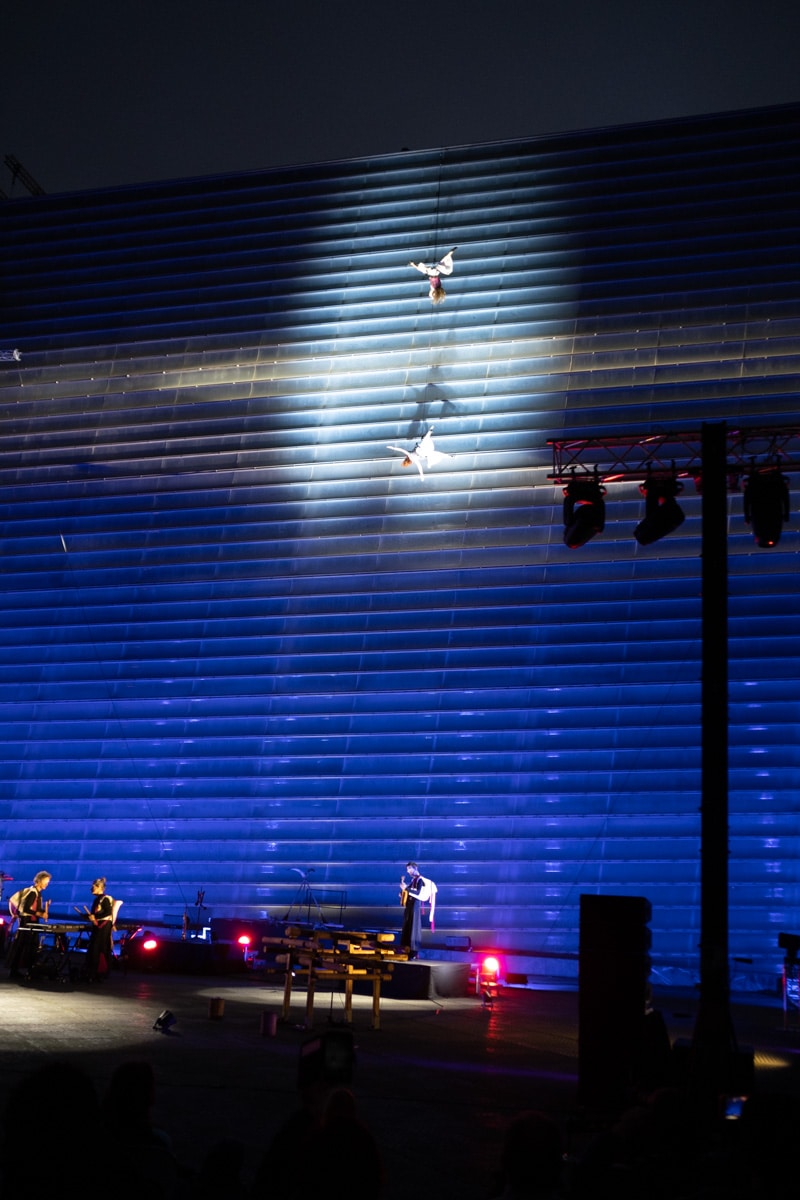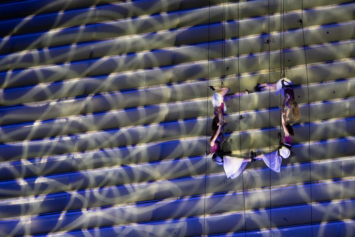 En una de las fachadas del Kursaal, al oscurecer, y ante la mirada de cientos de personas, se ha llevado a cabo hoy la representación de ‘Dendu’ de la mano de Harrobi Dantza Bertikala Konpainia y Oreka TX.