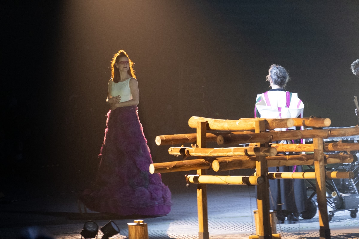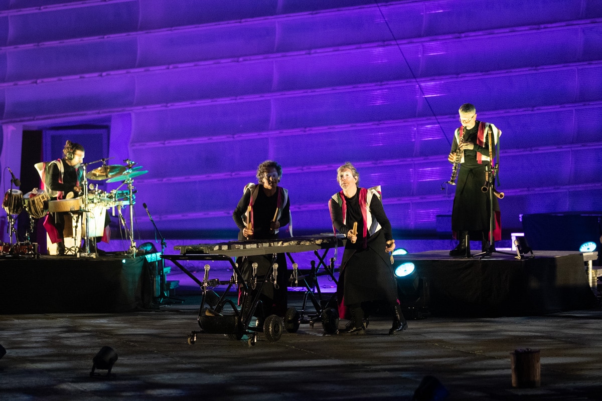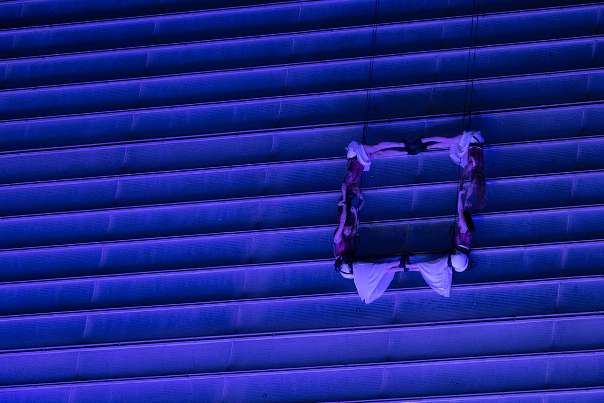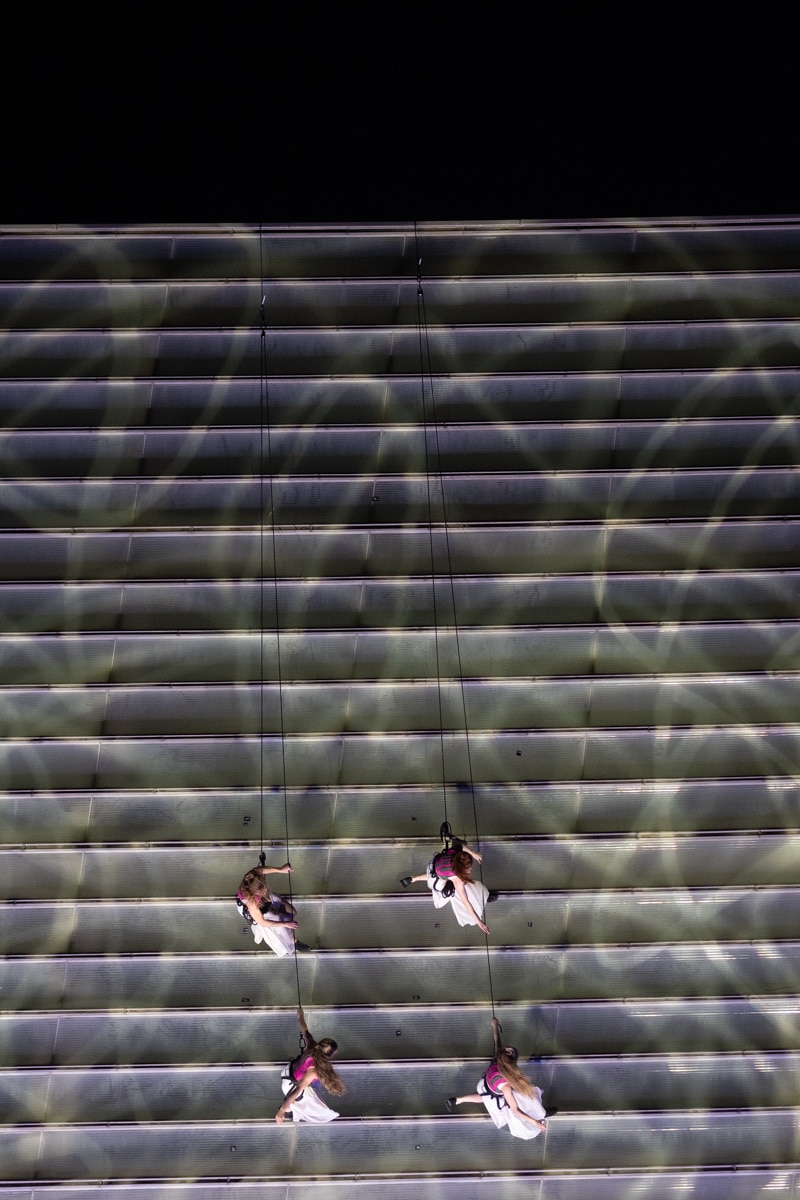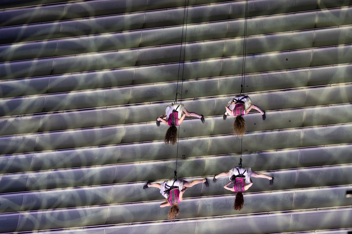En una de las fachadas del Kursaal, al oscurecer, y ante la mirada de cientos de personas, se ha llevado a cabo hoy la representación de ‘Dendu’ de la mano de Harrobi Dantza Bertikala Konpainia y Oreka TX.