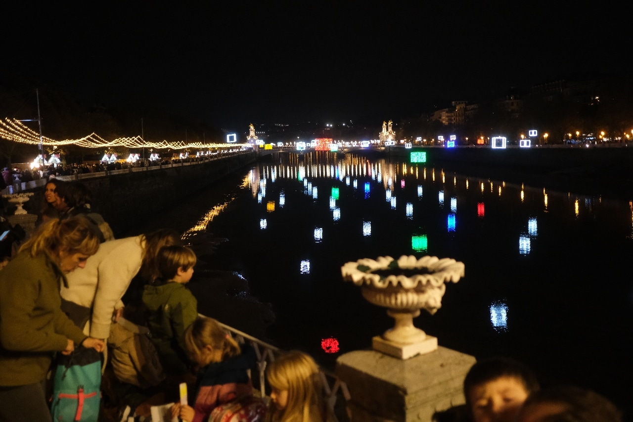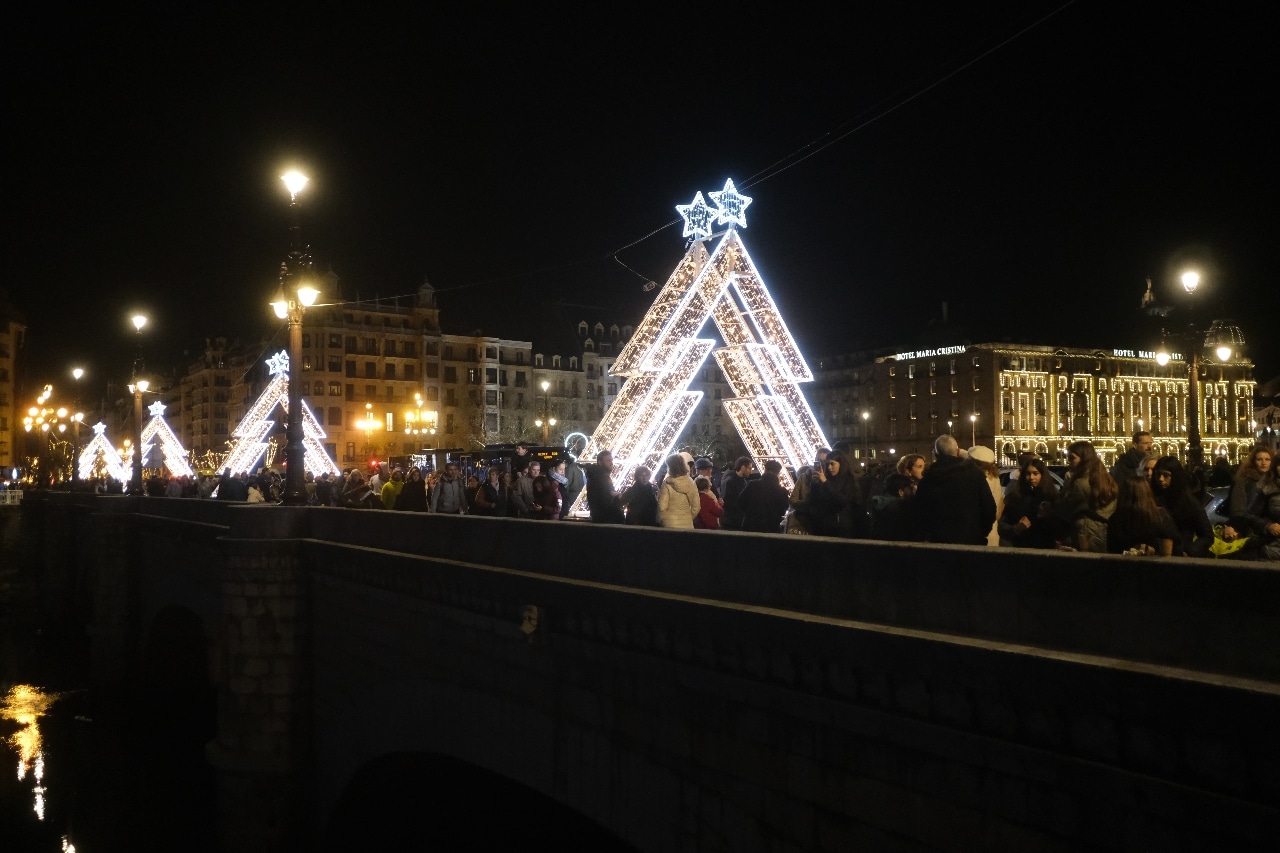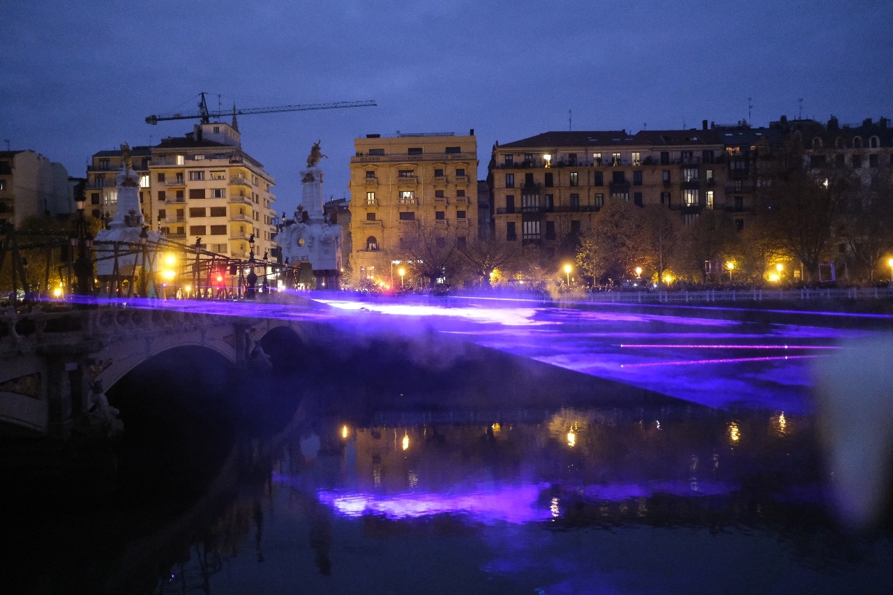 Miles de personas se han apostado en las cercanías del puente María Cristina, a ambos lados del río, para ver el espectáculo de luz y sonido que ha dado el pistoletazo de salida a las Navidades donostiarras.