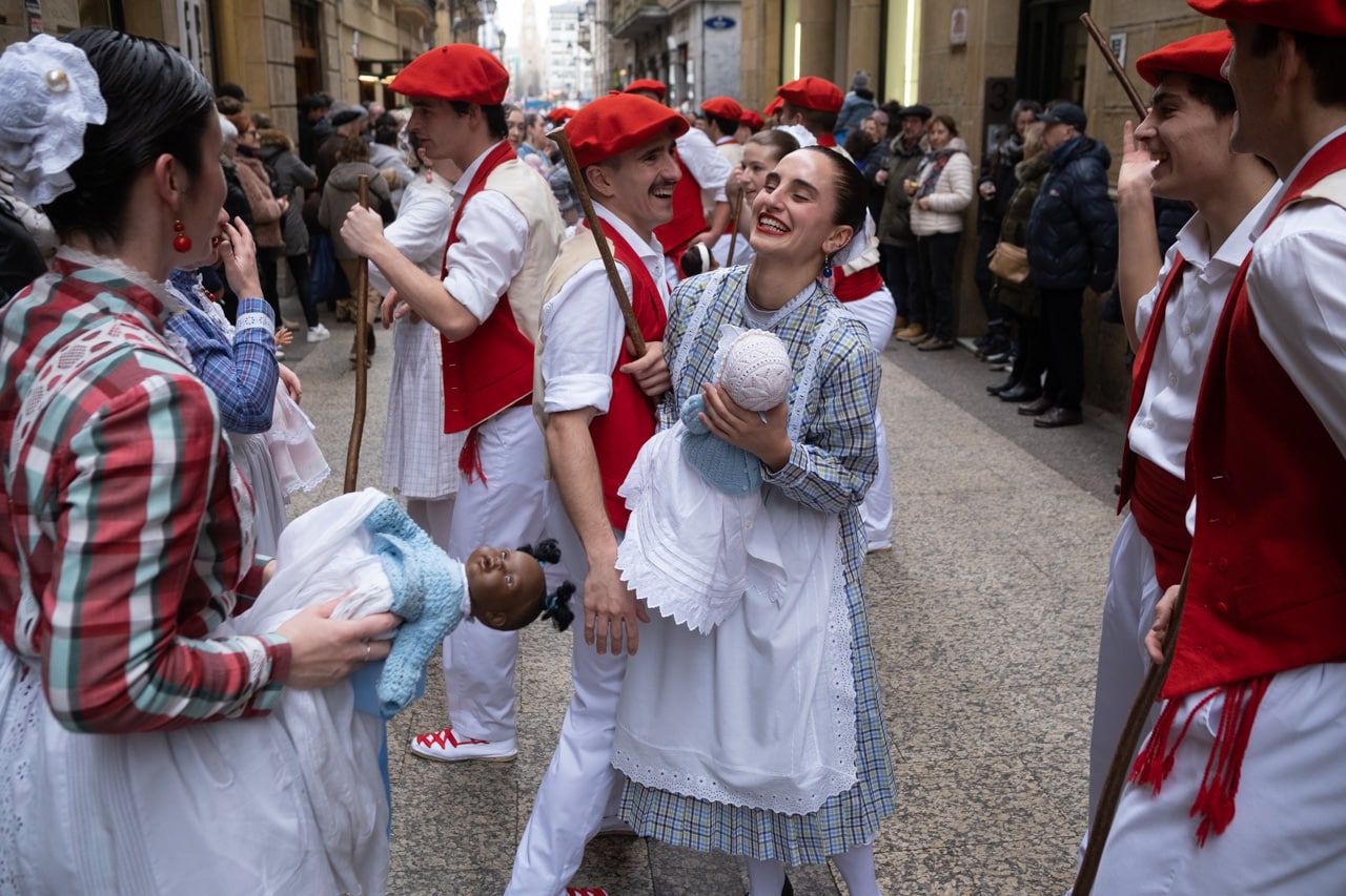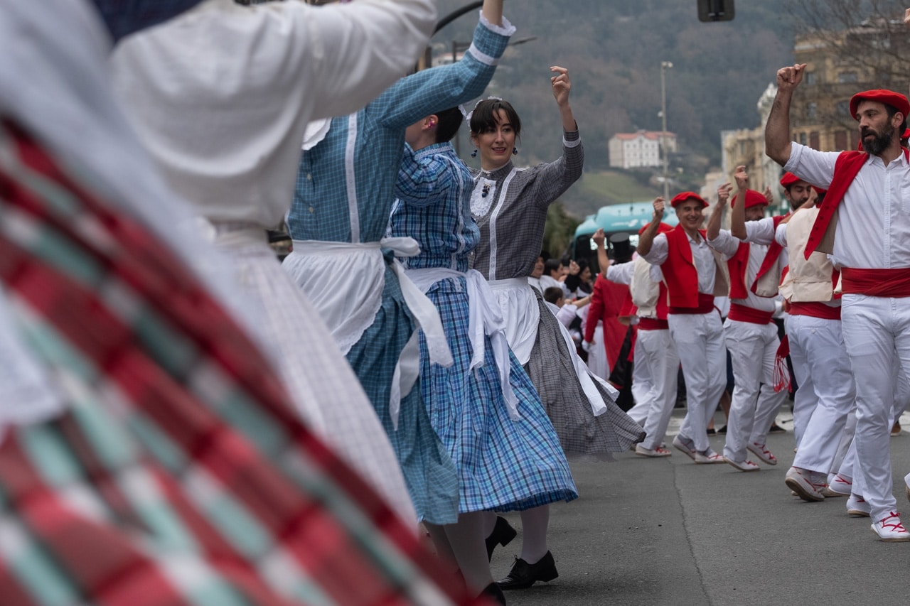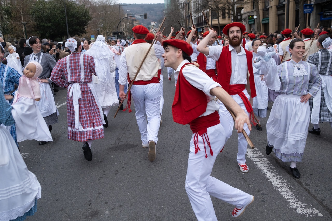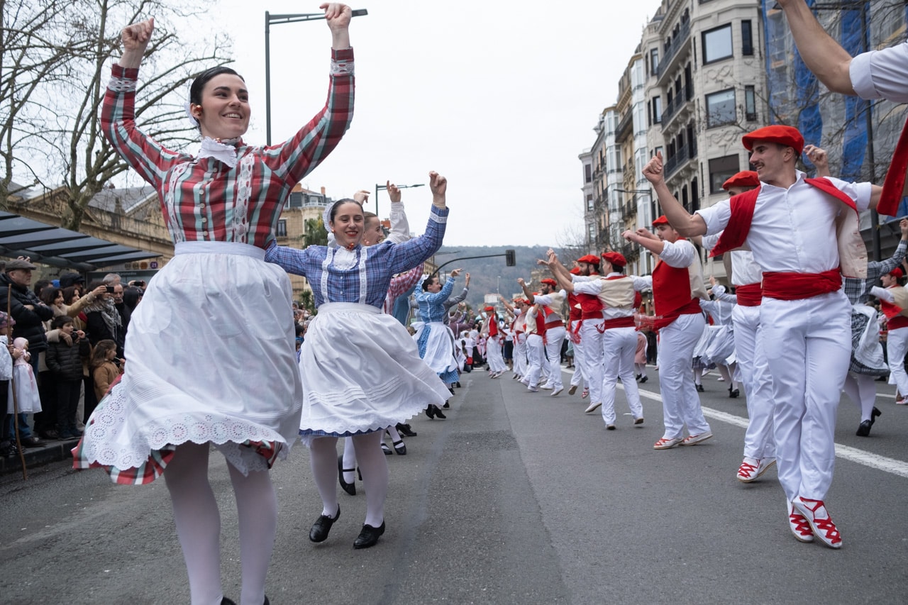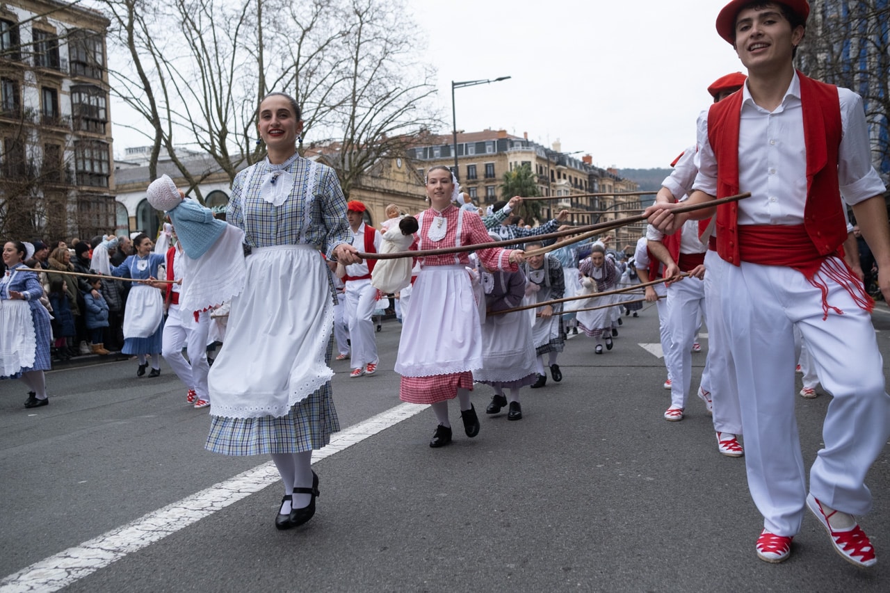 Una treintena de parejas ha participado este mediodía en la comparsa de “Inude eta Artzainak” de la Sociedad Kresala, que han salido este mediodía acompañadas por la txaranga The Joselontxos´s. También ha habido comparsas en Amara-Riberas y en Gros.