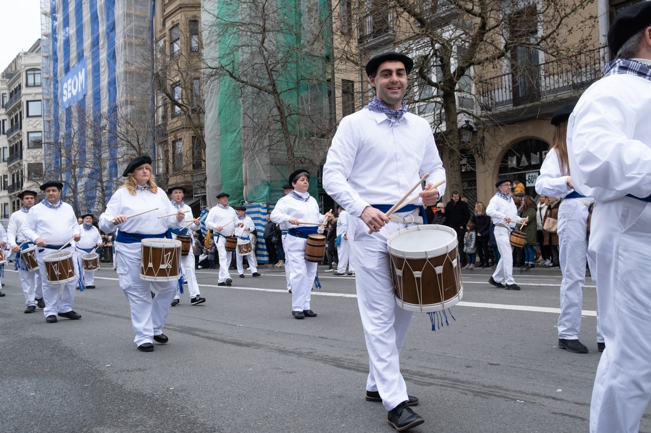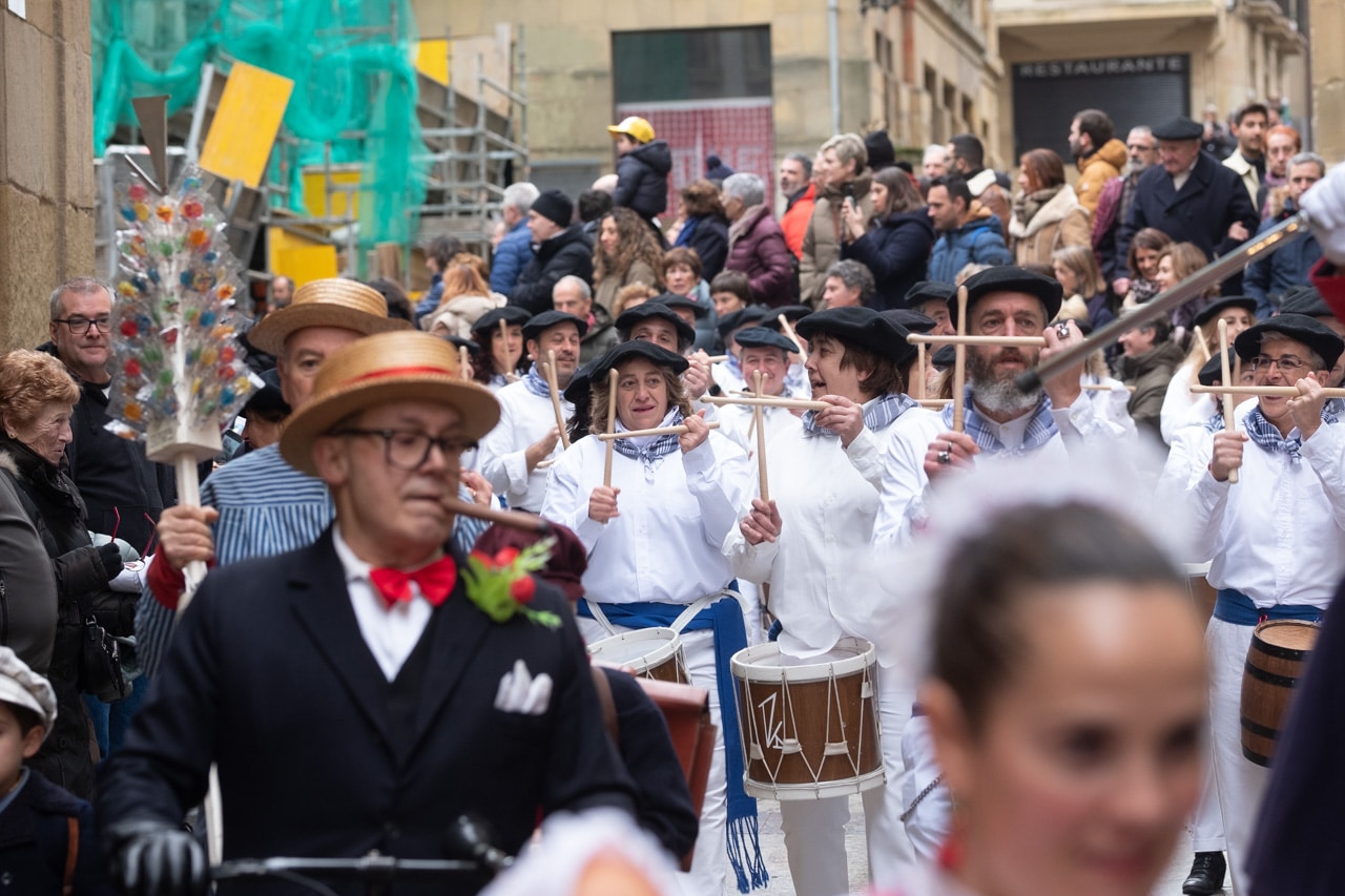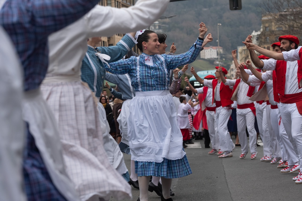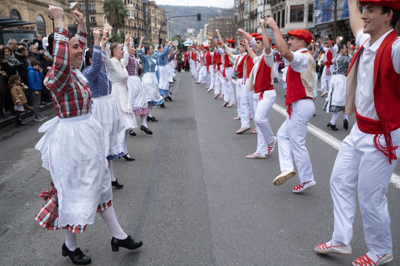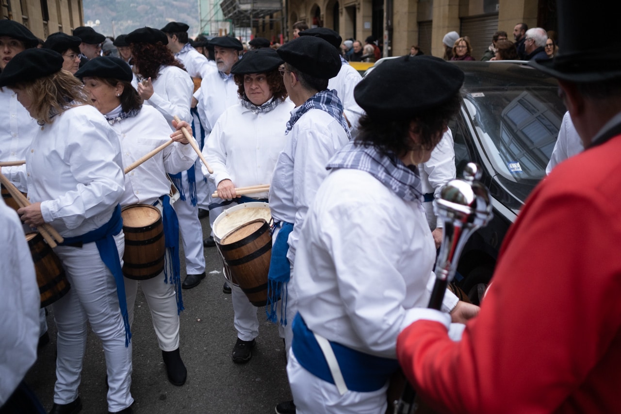 Una treintena de parejas ha participado este mediodía en la comparsa de “Inude eta Artzainak” de la Sociedad Kresala, que han salido este mediodía acompañadas por la txaranga The Joselontxos´s. También ha habido comparsas en Amara-Riberas y en Gros.