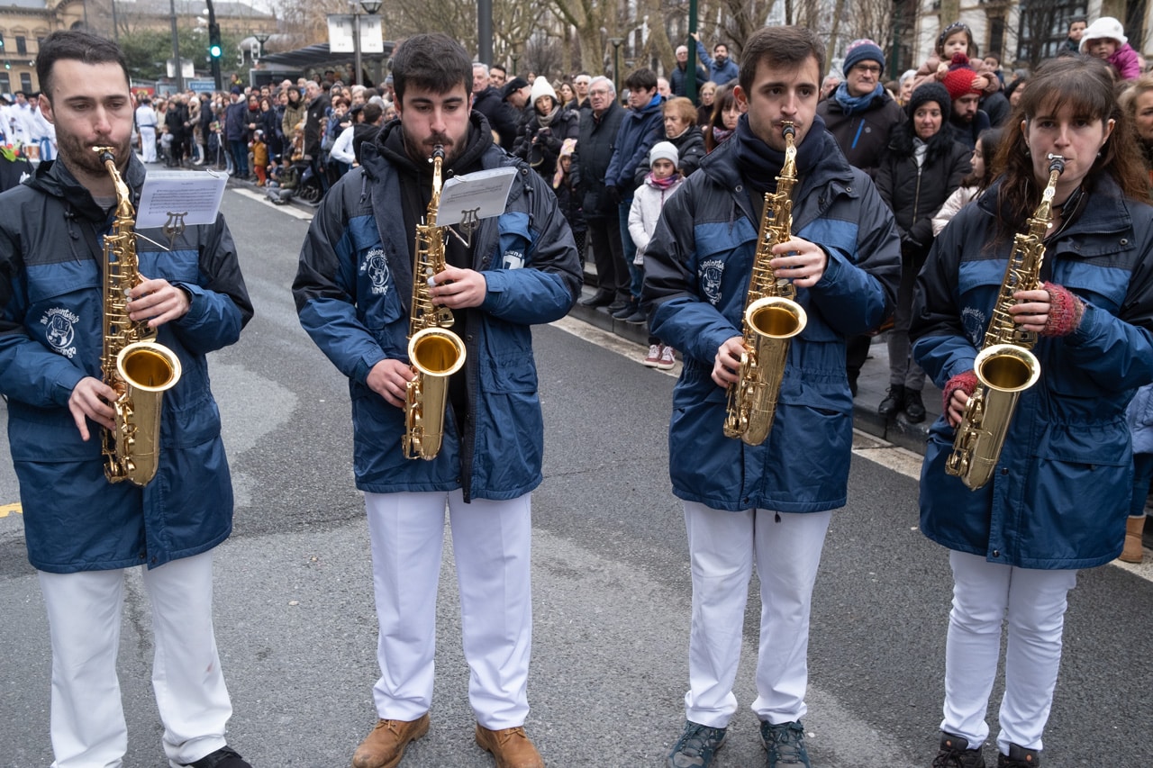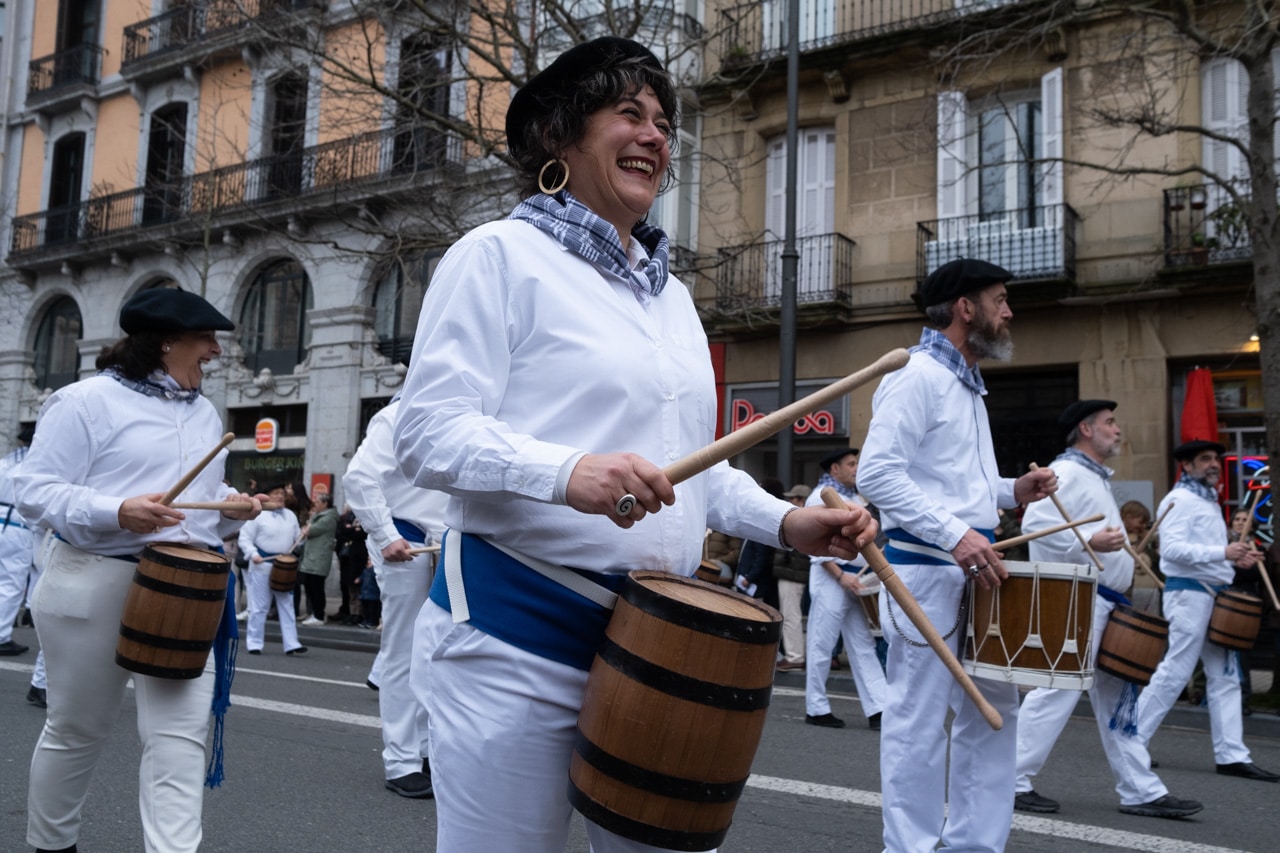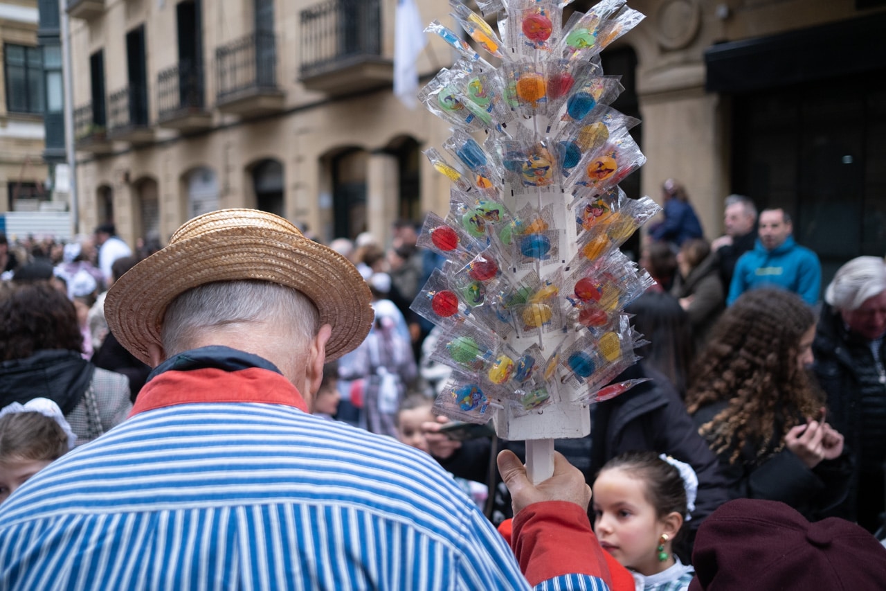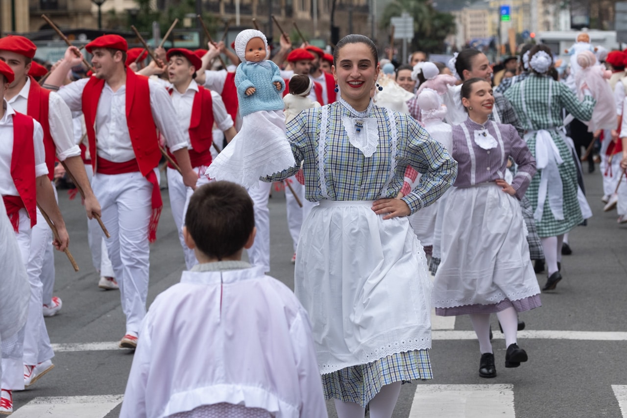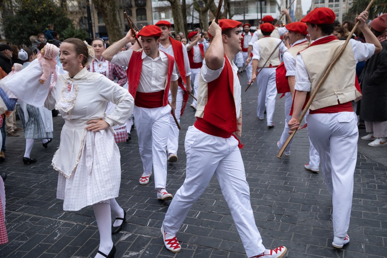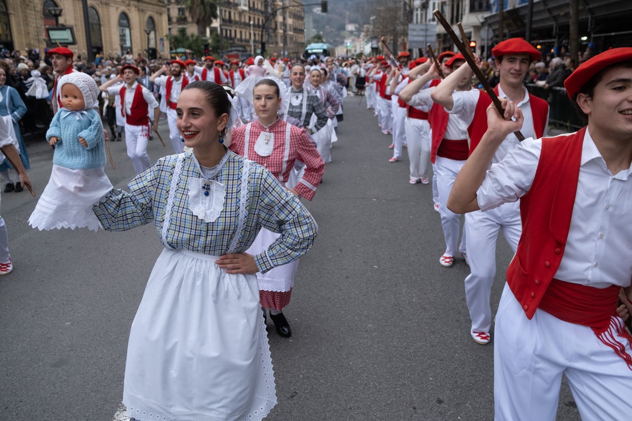 Una treintena de parejas ha participado este mediodía en la comparsa de “Inude eta Artzainak” de la Sociedad Kresala, que han salido este mediodía acompañadas por la txaranga The Joselontxos´s. También ha habido comparsas en Amara-Riberas y en Gros.