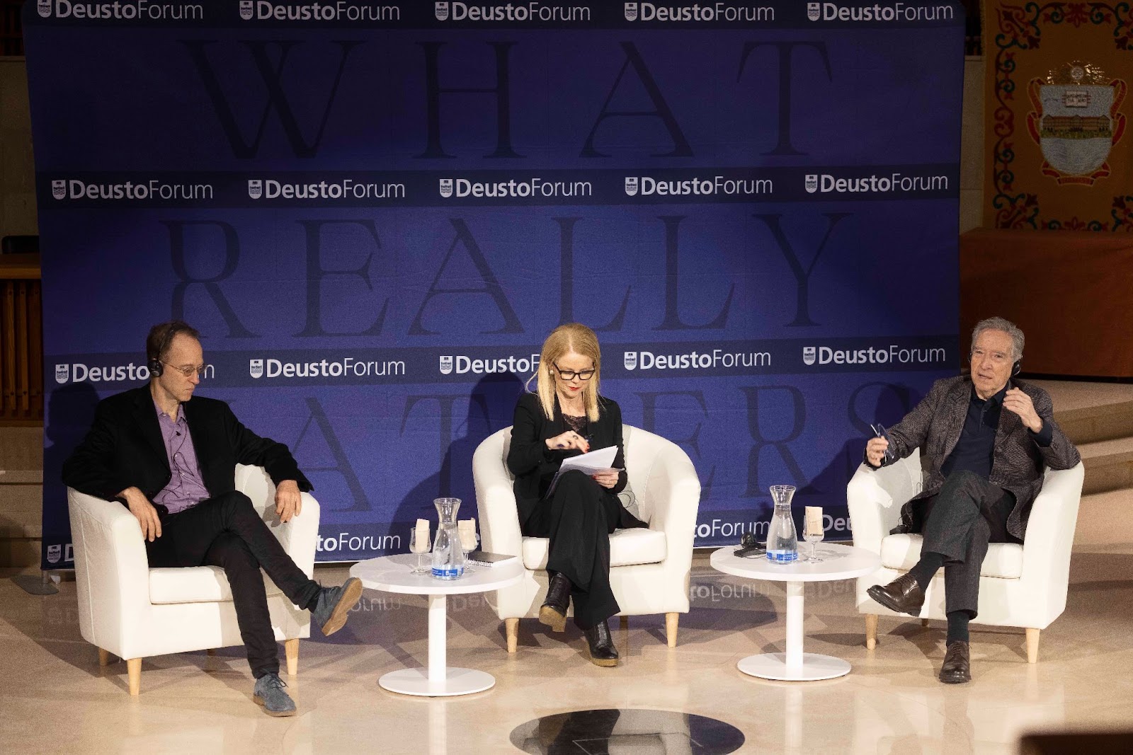 El campus de San Sebastián de la Universidad de Deusto ha acogido este viernes 10 de marzo una nueva jornada de reflexión organizada por DeustoForum en relación a la «Comunicación Política» a través de un diálogo entre Roane Carey, ex-redactor jefe del semanario The Nation-USA (1989-2021), e Iñaki Gabilondo, periodista y locutor referente de la comunicación en España. El diálogo ha sido moderado por Mª Pilar Rodríguez, profesora e investigadora de la Universidad de Deusto.