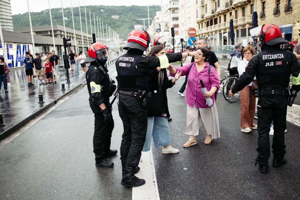 Los altercados se produjeron cuando los agentes obligaron a los manifestantes a cruzar la calzada y continuar con la protesta fuera del ámbito del Kursaal, extremo que disgustó al grupo, que sin embargo respetó la orden prácticamente en su totalidad.