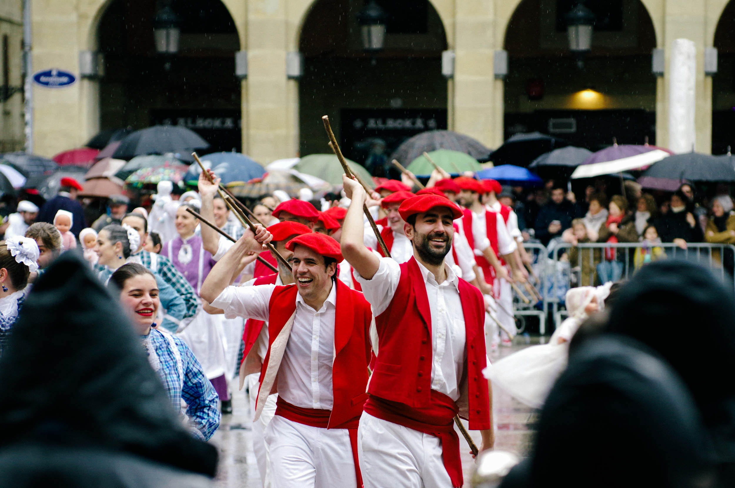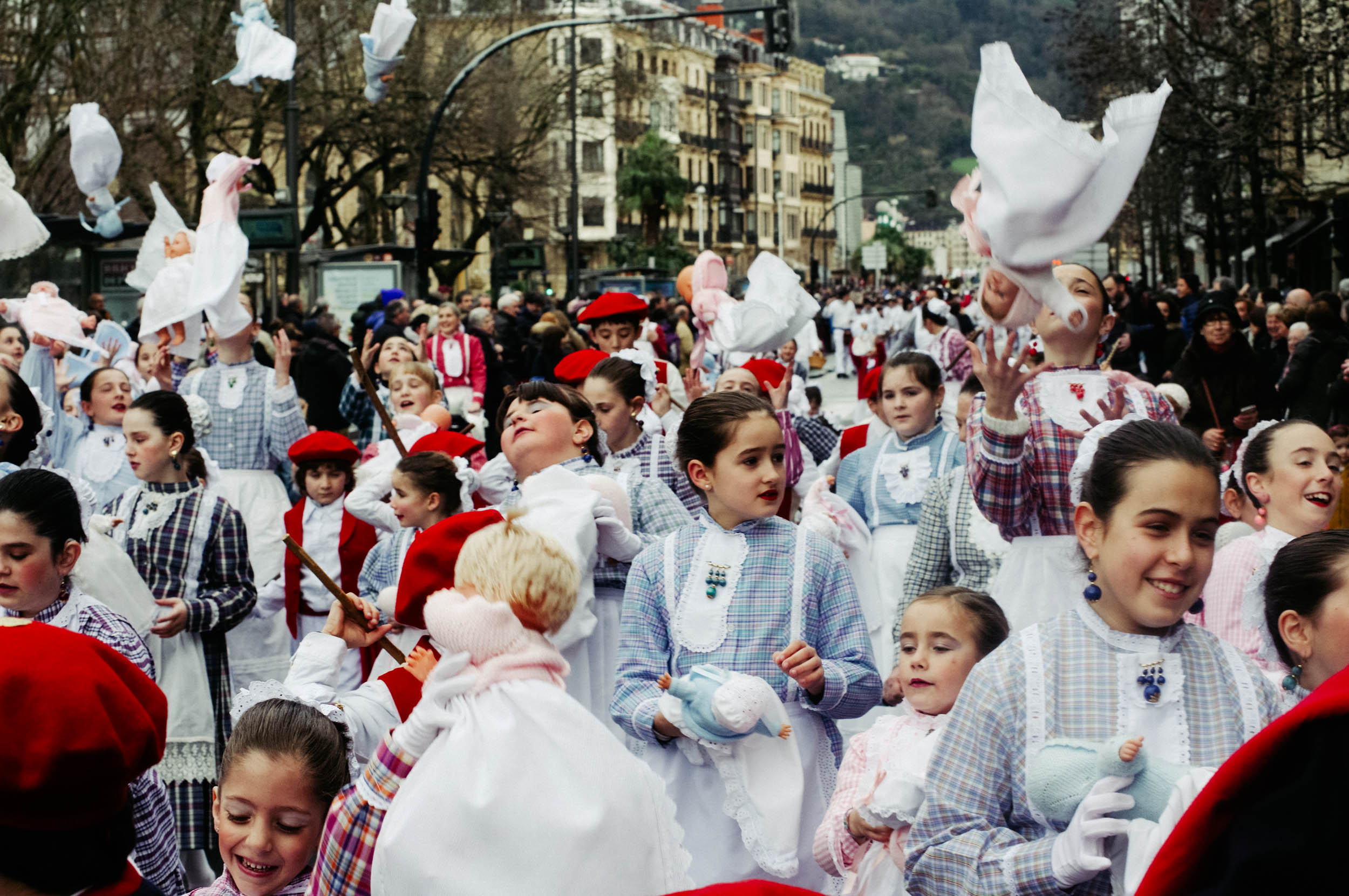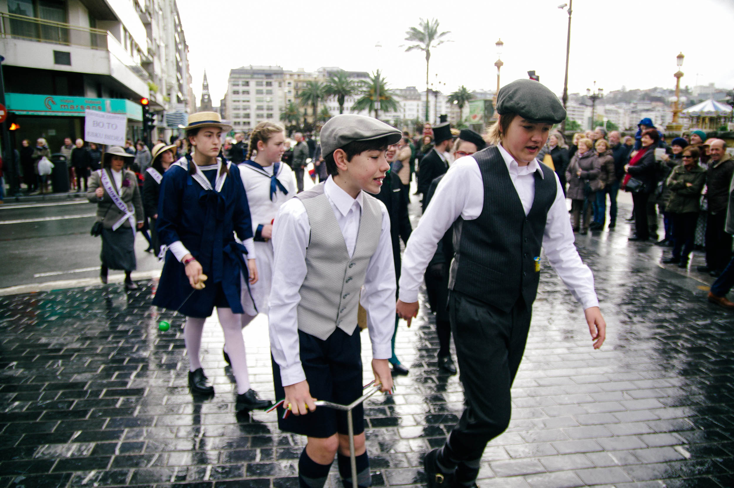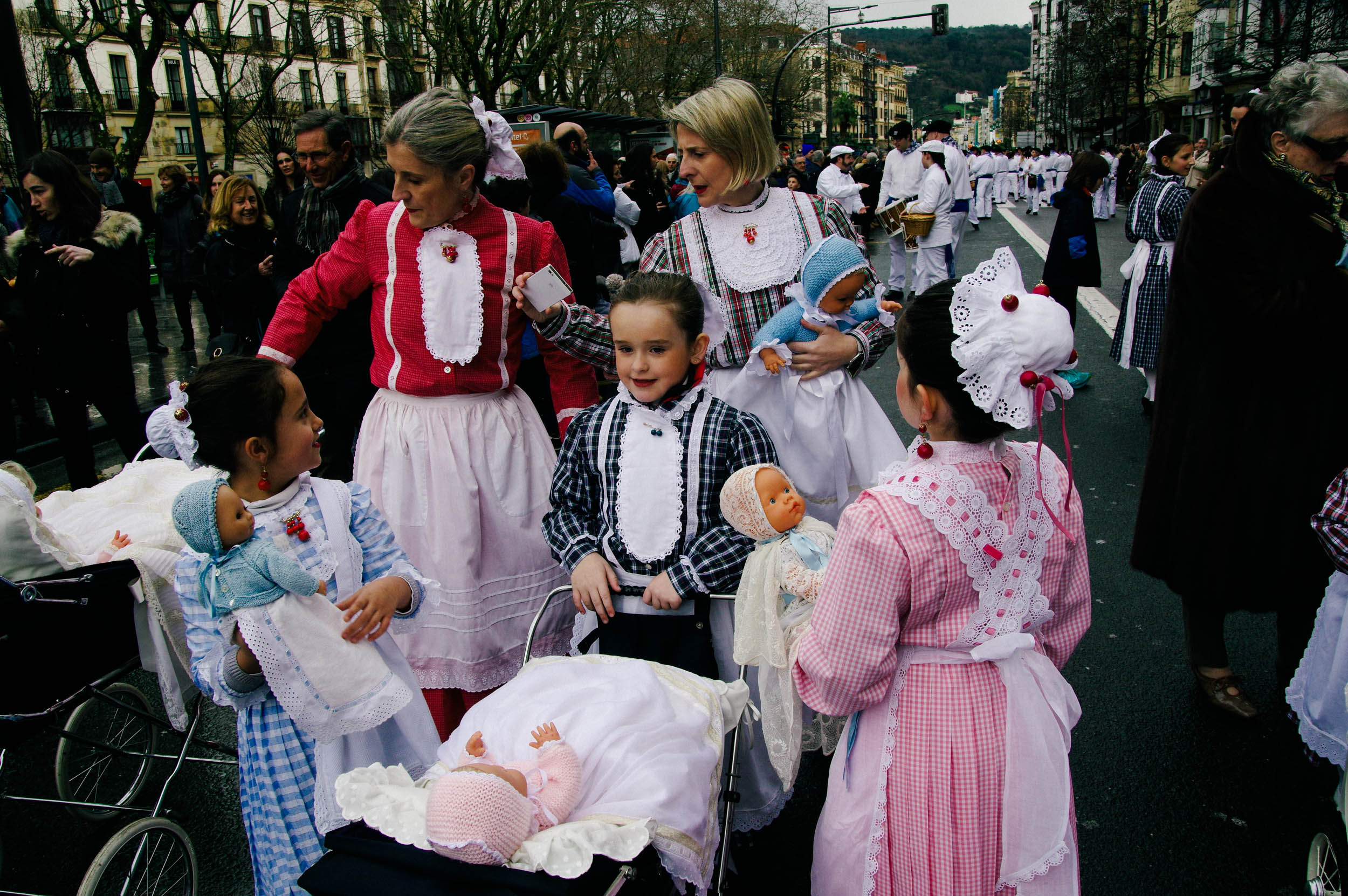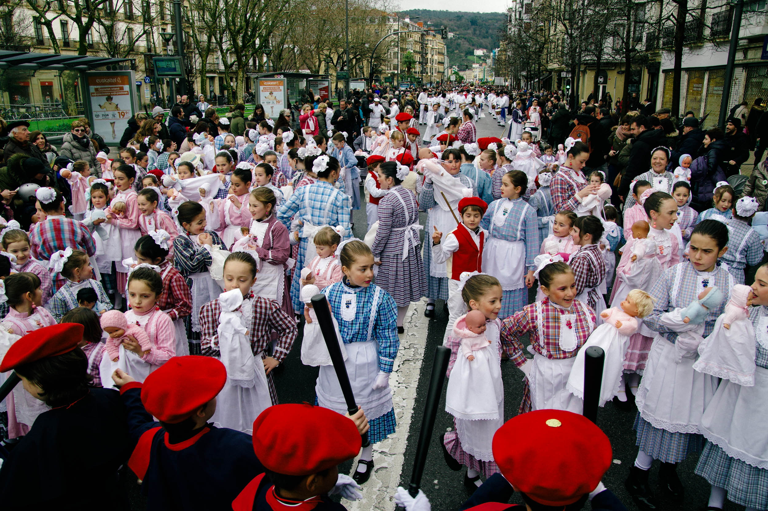 Inudes y artzaiak, nodrizas y pastores, han desfilado un año más por la Parte Vieja (con el perdón de la lluvia hasta que han entrado en la plaza de la Constitución) con los galanteos propios de la fiesta y con muy buen ambiente pese al tiempo. Como todos los años inudes y artzaiak han recorrido las calles con la música de Sarriegui moviendo sus ‘bebés’ con su particular coreografía en una tradición que se remonta a 1885 y que cobra fuerza año tras año.