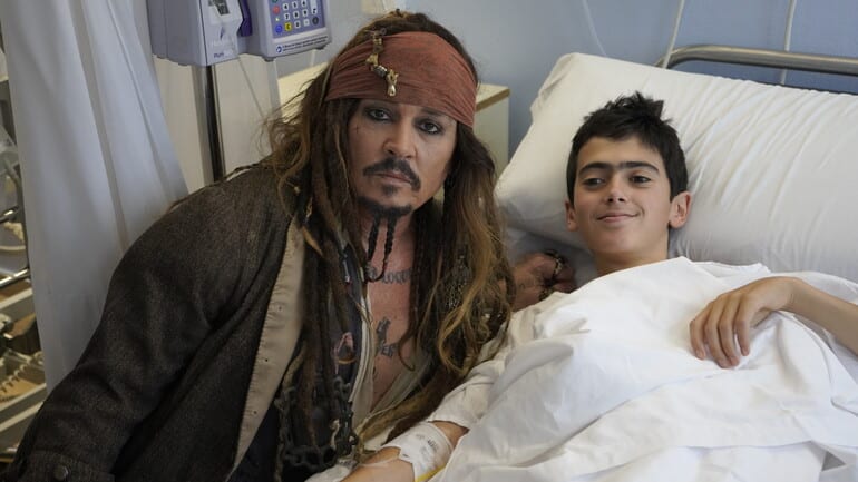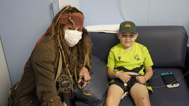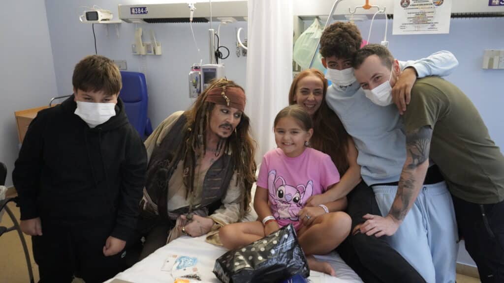 Convertido de nuevo pirata el actor se ha acercado a los chavales y se ha hecho numerosas fotos. Han compartido risas y anécdotas, y les ha ayudado a olvidar por unos minutos las dificultades que están atravesando.