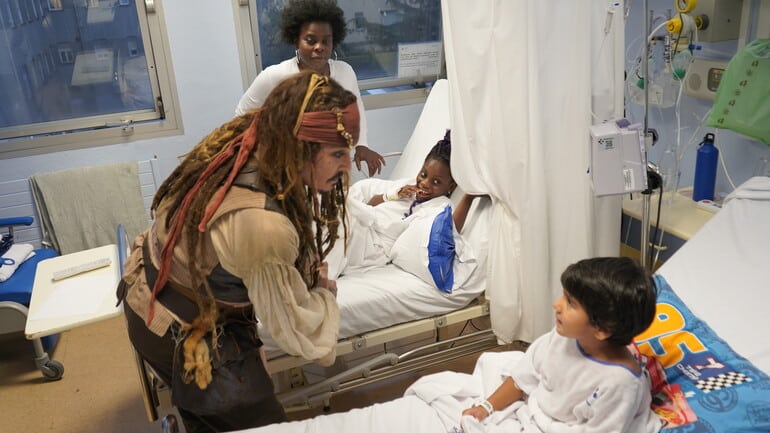 Este jueves por la tarde el actor estadounidense Johnny Depp, uno de los grandes protagonistas de esta edición del Festival de San Sebastián, se ha puesto la ropa de su personaje más icónico, el pirata Jack Sparrow, para visitar a los más jovencitos del Hospital Donostia que están ingresados en la planta de Pediatría y Oncología.