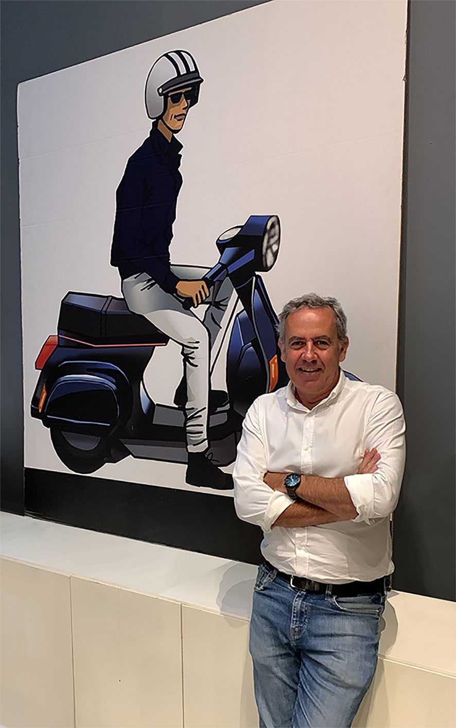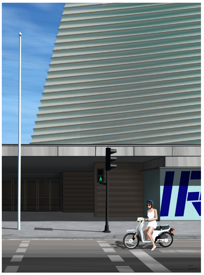 Hacia el año 2000, cuenta Álvarez, dio el salto al entorno digital tras pasar una temporada en un espacio alquilado en el que pintaba cuadros abstractos. “Me tuve que ir cuando se me terminó el contrato de alquiler. Me quedé sin local y por una cuestión de comodidad empecé a dibujar digitalmente”. Entonces, decidió centrar el tiro en lo que veía a su alrededor y, para su sorpresa, descubrió que sus ilustraciones de temática donostiarra tenían su público. Había encontrado una fórmula en la que no suelen faltar varios ejes fundamentales como el mar, el río, la lluvia y su amor por la arquitectura. El conductor de la Scooter con el que el ilustrador donostiarra sale posando en la fotografía se convirtió en una de sus señas de identidad, emulando de alguna manera la famosa Vespa azul del director italiano Nani Moretti en la película Caro diario.