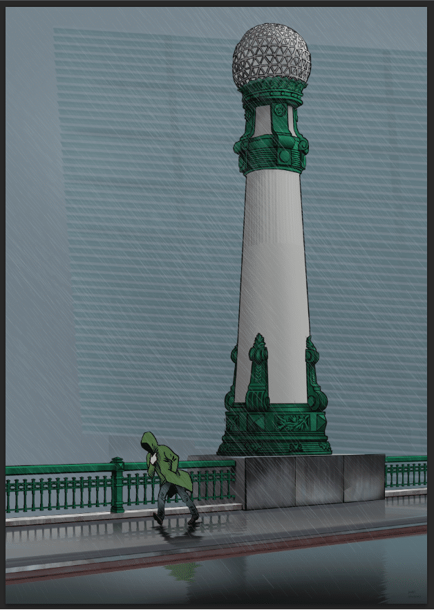 Influido por una serie de artistas muy dispares (los pintores Edward Hopper y David Hockney, la serie de cómics Corto Maltés, Tintín…), lo que él denomina un “potaje y bombardeo anárquico” de referentes en el que caben hasta las historietas de Marvel. En su primera ilustración digital aparecía un chico sentado en un banco del monte Urgull mirando el mar. Álvarez guarda especial cariño por aquellas escenas que pueden contener una historia detrás y que no se quedan en una mera representación de la realidad. A este grupo pertenecen, entre otras obras, una ilustración de un hombre abrigado con una parka verde cruzando el puente del Kursaal bajo una intensa lluvia, y otra pieza reciente en la que se ve a una mujer pasando por un portal del centro, “cerca del bar Pokhara”, sobre un suelo húmedo.