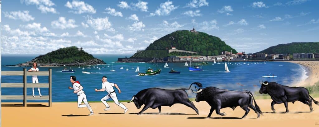 Esa es la San Sebastián que prefiere retratar Álvarez. Sin embargo, la realidad es bien distinta y le piden “muchos encargos relacionados con la bahía de la Concha en todas sus versiones”, normalmente para celebraciones y cumpleaños. Como curiosidad, existe un peculiar dibujo que conecta los sanfermines y la Concha a través de un encierro que tiene lugar a la altura del Palacio Miramar con el mar y la playa de fondo. “Hay veces que alucino”, exclama divertido. Además de en su propia web, los trabajos de Juan Álvarez han sido expuestos en bares, galerías y espacios de todo tipo en Donostia y alrededores desde hace más de una década.
