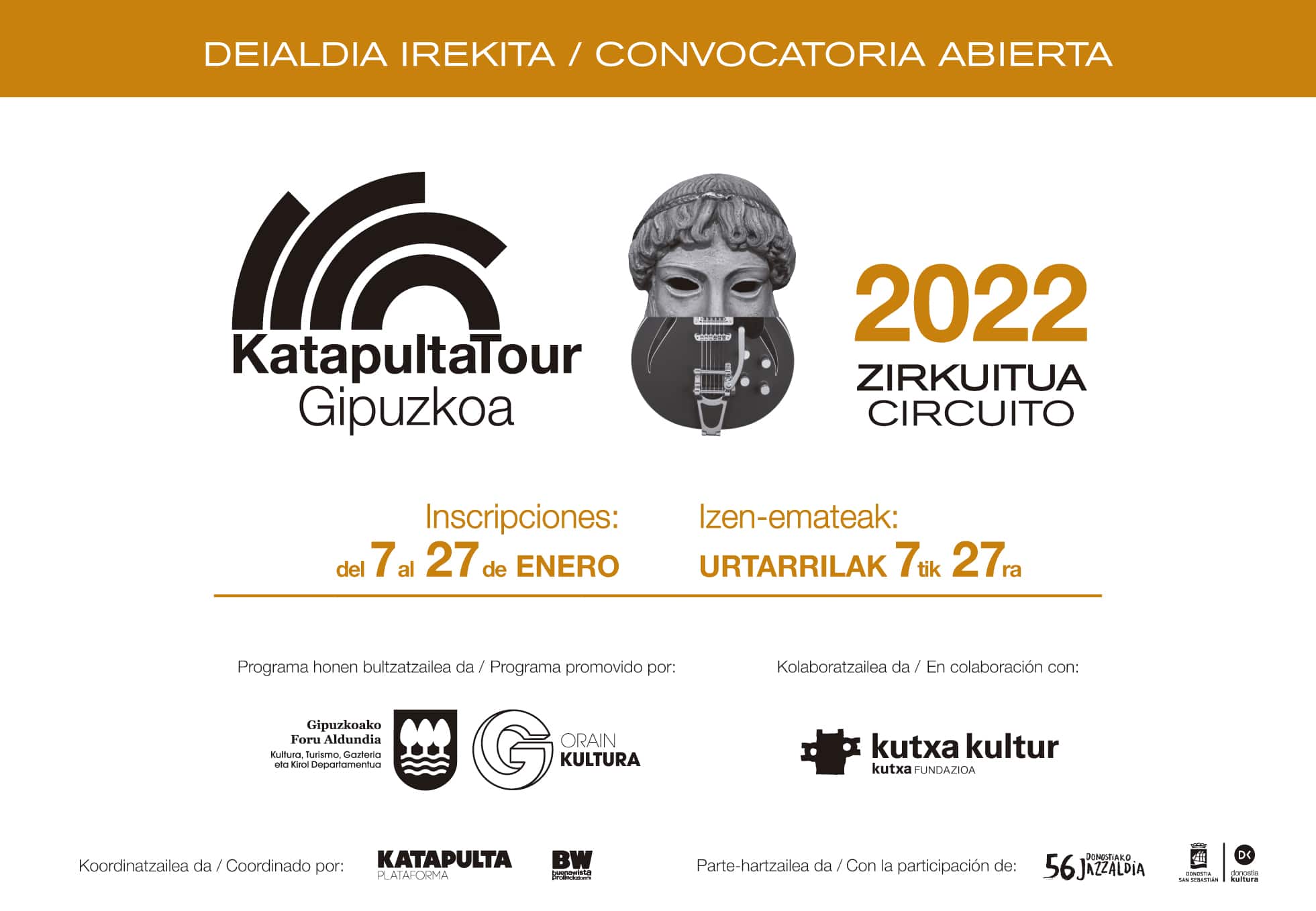 El programa Katapulta Tour Gipuzkoa de la Diputación Foral de Gipuzkoa tiene abierta la convocatoria para la selección de nuevos artistas participantes en el circuito de actuaciones musicales y de artes escénicas de pequeño formato que se celebrará a lo largo de 2022 en el Territorio. Las propuestas deberán ser presentadas hasta el 27 de enero de 2022 en este enlace.