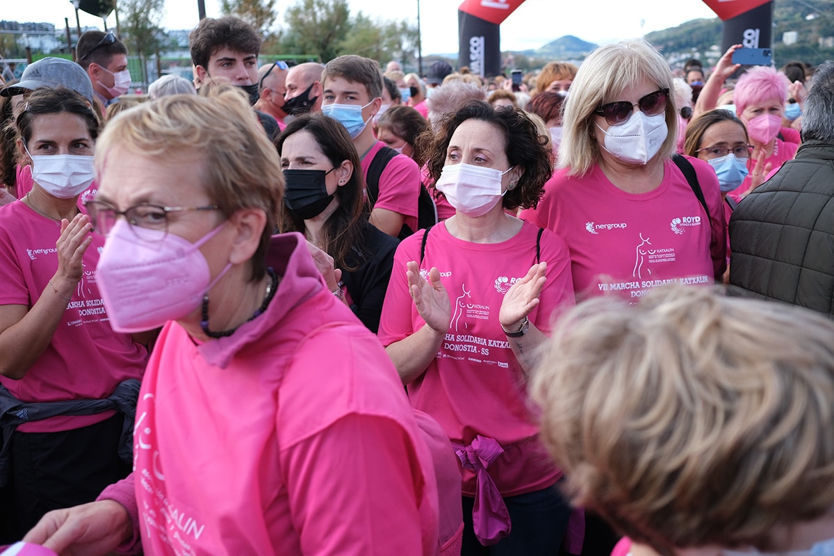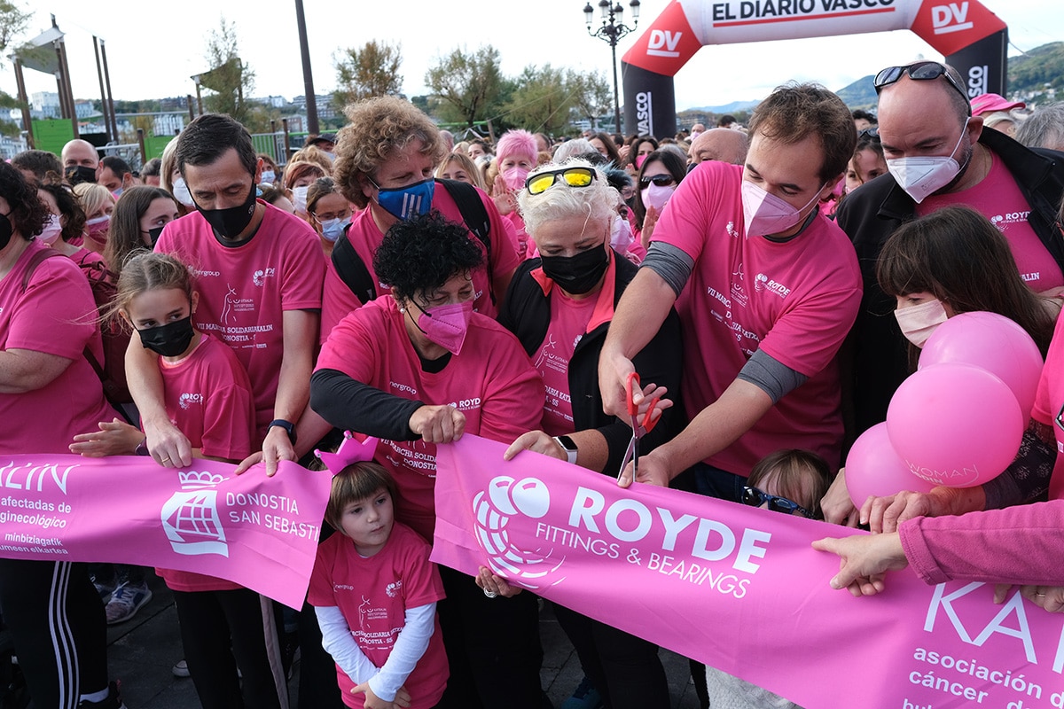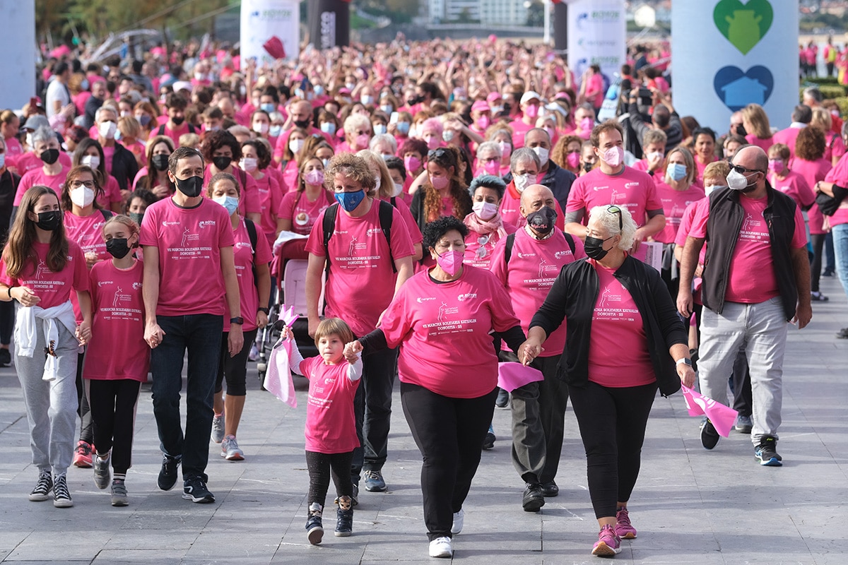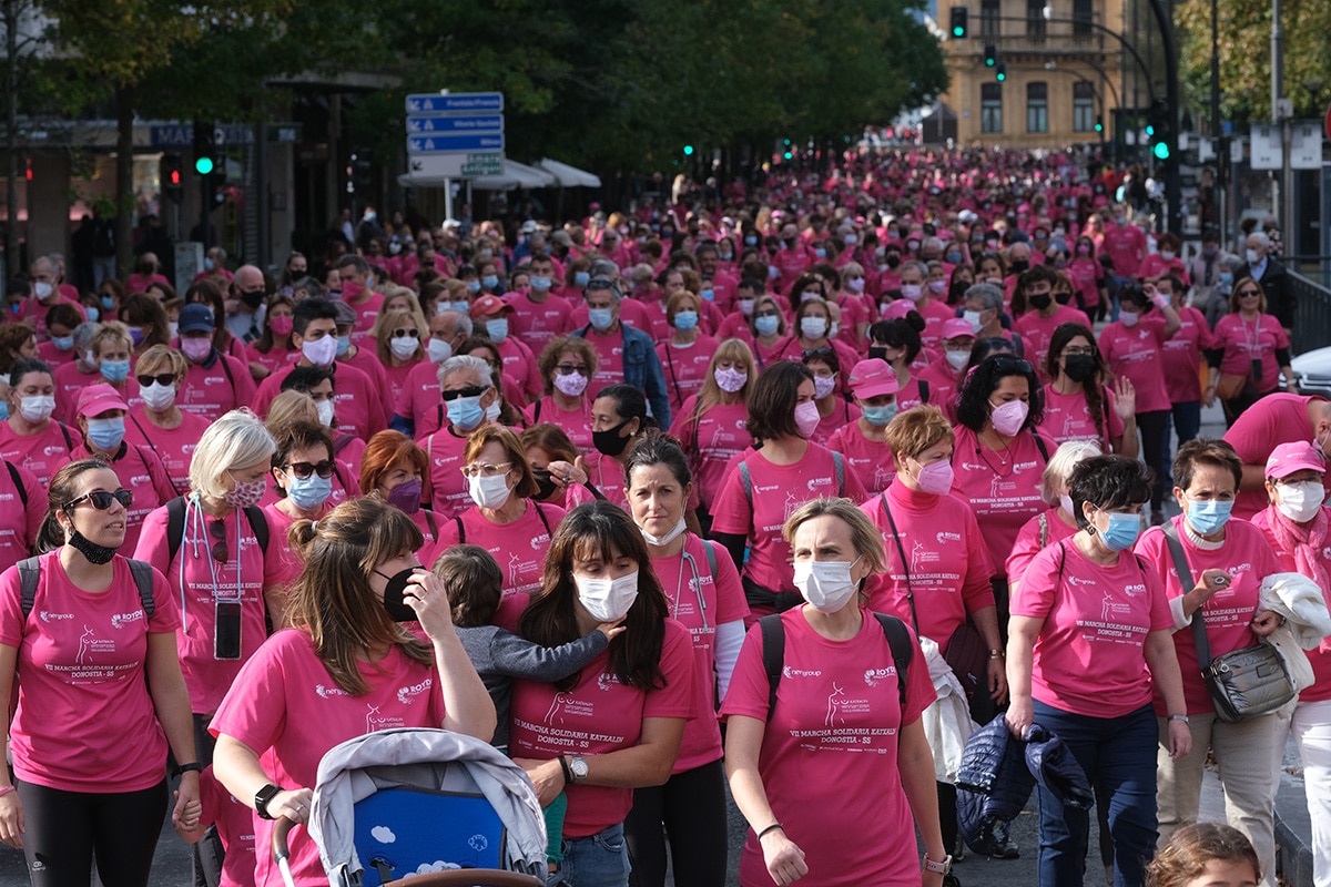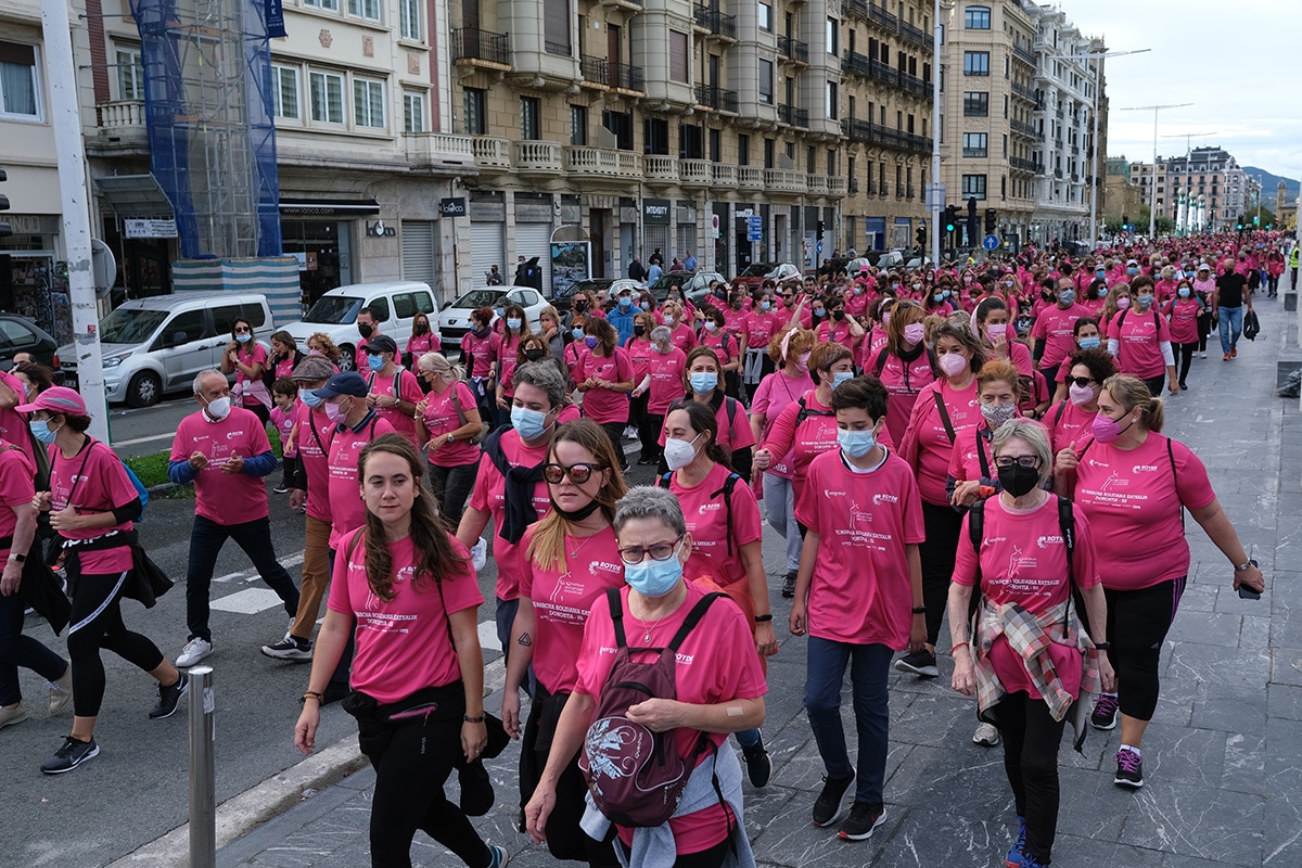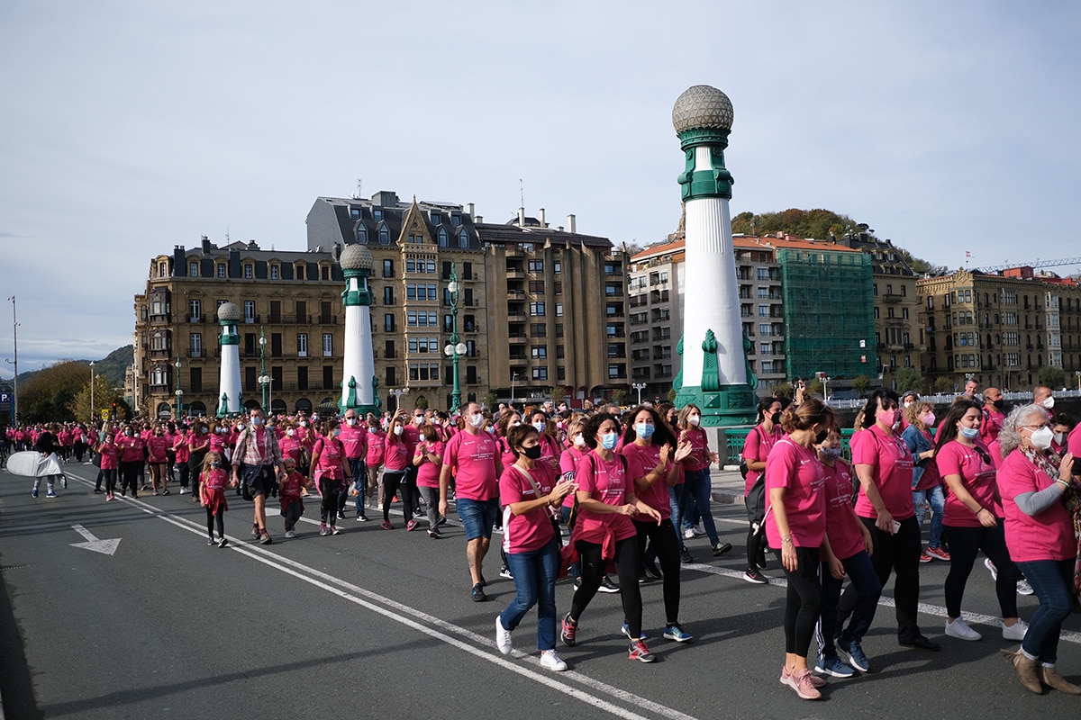 La llamada de Katxalin ha sido respondida por miles de personas que han participado hoy en la marea rosa de Donostia, la séptima que organiza la asociación de Mujeres Afectadas de Cáncer de Mama y Ginecológico de Gipuzkoa para lograr fondos en favor de la investigación. El año pasado no pudo celebrarse por la pandemia.