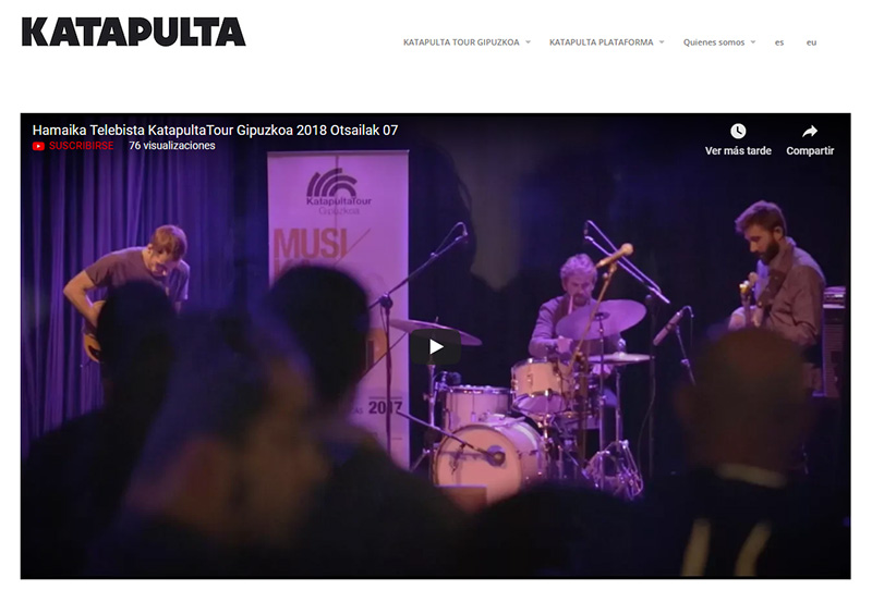 Katapulta, que nació en el seno de la asociación cultural sin ánimo de lucro Buenawista Prolleckziom’s, tiene tres líneas de trabajo: Katapulta Tour Gipuzkoa (circuito de artes escénicas y música que va por la tercera edición y cuenta con la colaboración de Diputación y Kutxa Kultur), Katapulta Action (exposiciones de pintores, fotógrafos, actuaciones de artes escénicas con un artista o creador) y las muestra interdisciplinares de creadores Katapulta.