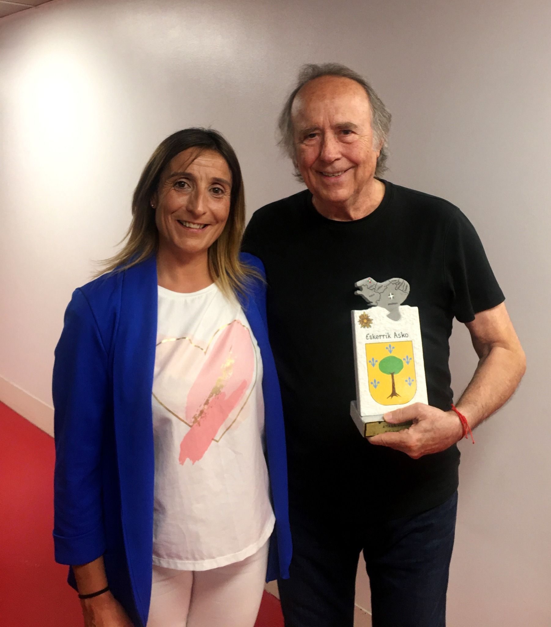Joan Manuel Serrat ha dado dos grandes en el Kursaal con motivo de su gira de despedida. Lo ha hecho este pasado fin de semana y no quisieron los vecinos de Villabona desperdiciar la ocasión de reunirse con el cantautor y dejar constancia de la relación de éste con la localidad gipuzkoana. La alcaldesa Beatriz Unzue le hizo entrega de un recuerdo del municipio.