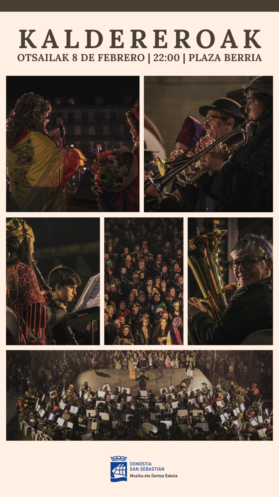 La Banda de la Escuela Municipal de Música y Danza de San Sebastián será también protagonista de la noche. Con 130 intérpretes dirigidos por Juan José Ocón y Mikel Olazabal, llenará la plaza de melodías carnavalescas a partir de las 22 horas. Su música acompañará el bullicio de las comparsas, que al compás de los martillos y sartenes anunciarán la llegada del Carnaval.