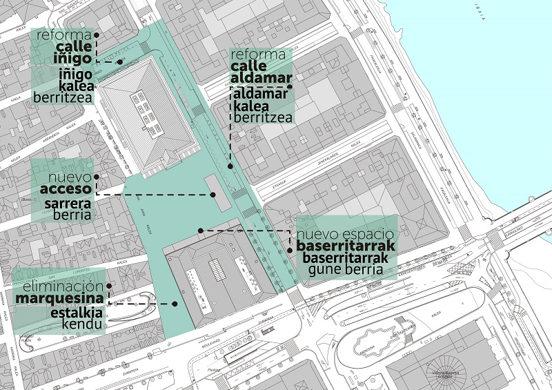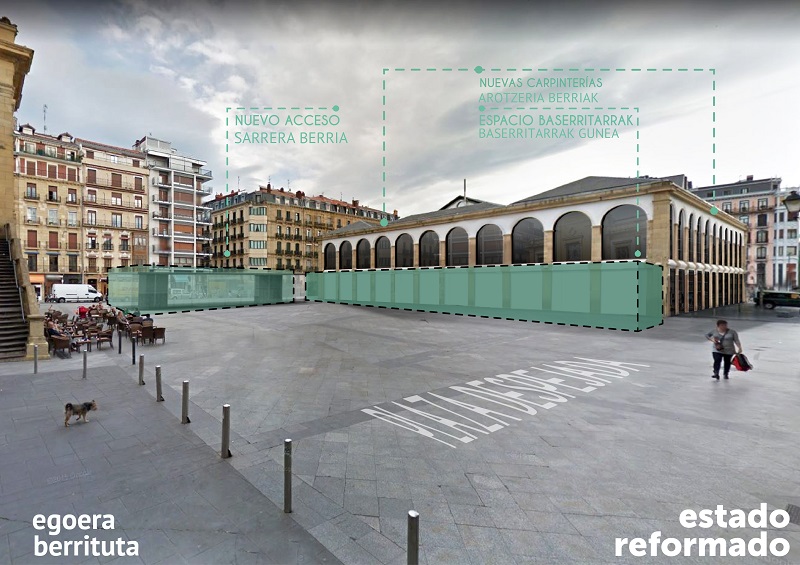 En la primera planta del edificio Pescadería habrá un espacio destinado a un proyecto de promoción del producto local y la gastronomía vasca. Junto al traslado del mercado tradicional a la planta a pie de calle del edificio Pescadería, los puestos de los baserritarras también verán modificada su ubicación de la calle San Juan a la fachada sur del edificio Arkoak en la misma plaza de la Bretxa. La desaparición del conocido como ‘tupperware’ supondrá la creación de una plaza. Todo ello conllevará la modificación del acceso a la zona subterránea, que se trasladará al costado de la plaza, es decir, a la parte más próxima a la calle Aldamar, desde donde se accederá a los comercios del sótano.