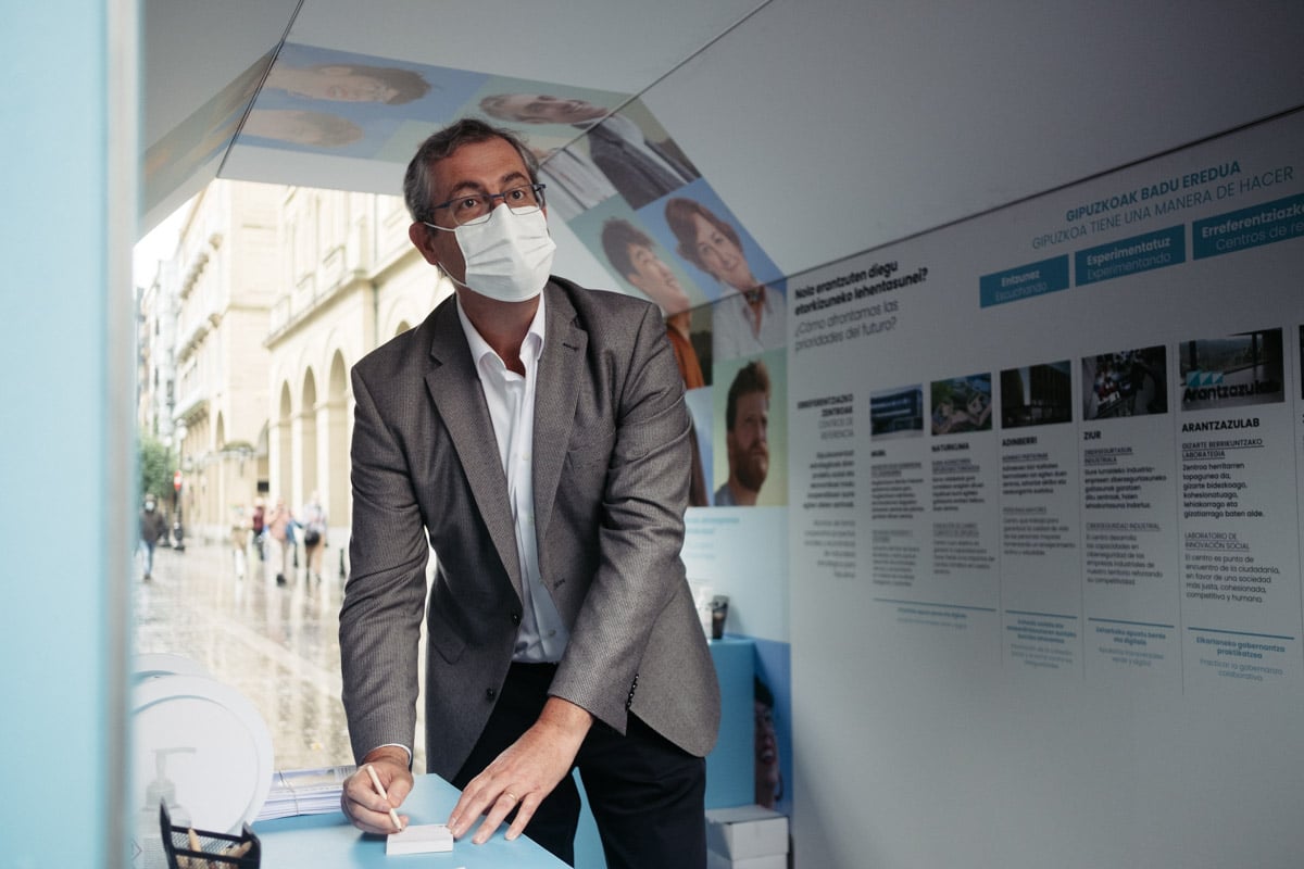 «La ciudadanía tiene que tomar partido y responder qué territorio de Gipuzkoa quiere para 2040. Es la gran pregunta», ha incidido esta mañana el diputado general Markel Olano. Y es que tras hacer escala en ocho municipios, la cápsula Etorkizuna Eraikiz ha llegado esta mañana a la Plaza Gipuzkoa con el objetivo de recoger las aportaciones, reflexiones e inquietudes de la ciudadanía donostiarra. Hasta ahora han participado más de mil personas.