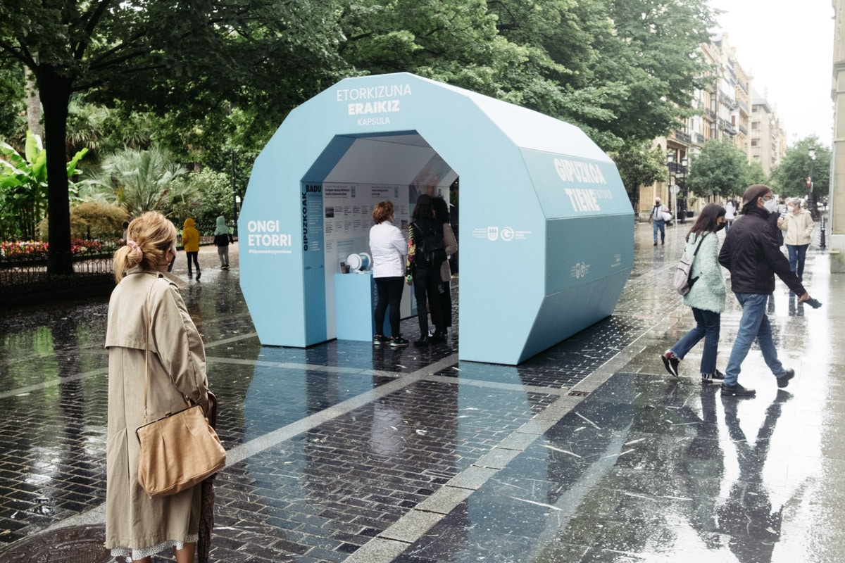 Durante este último mes la cápsula Etorkizuna Eraikiz ha recorrido las comarcas de todo el territorio y se ha ubicado en ocho localidades (Donostia, Arrasate, Irun, Tolosa, Beasain, Eibar, Zarautz y Errenteria). Hoy, por segunda vez, ha llegado a la capital guipuzcoana en su última parada antes de retomar la dinámica en otoño.