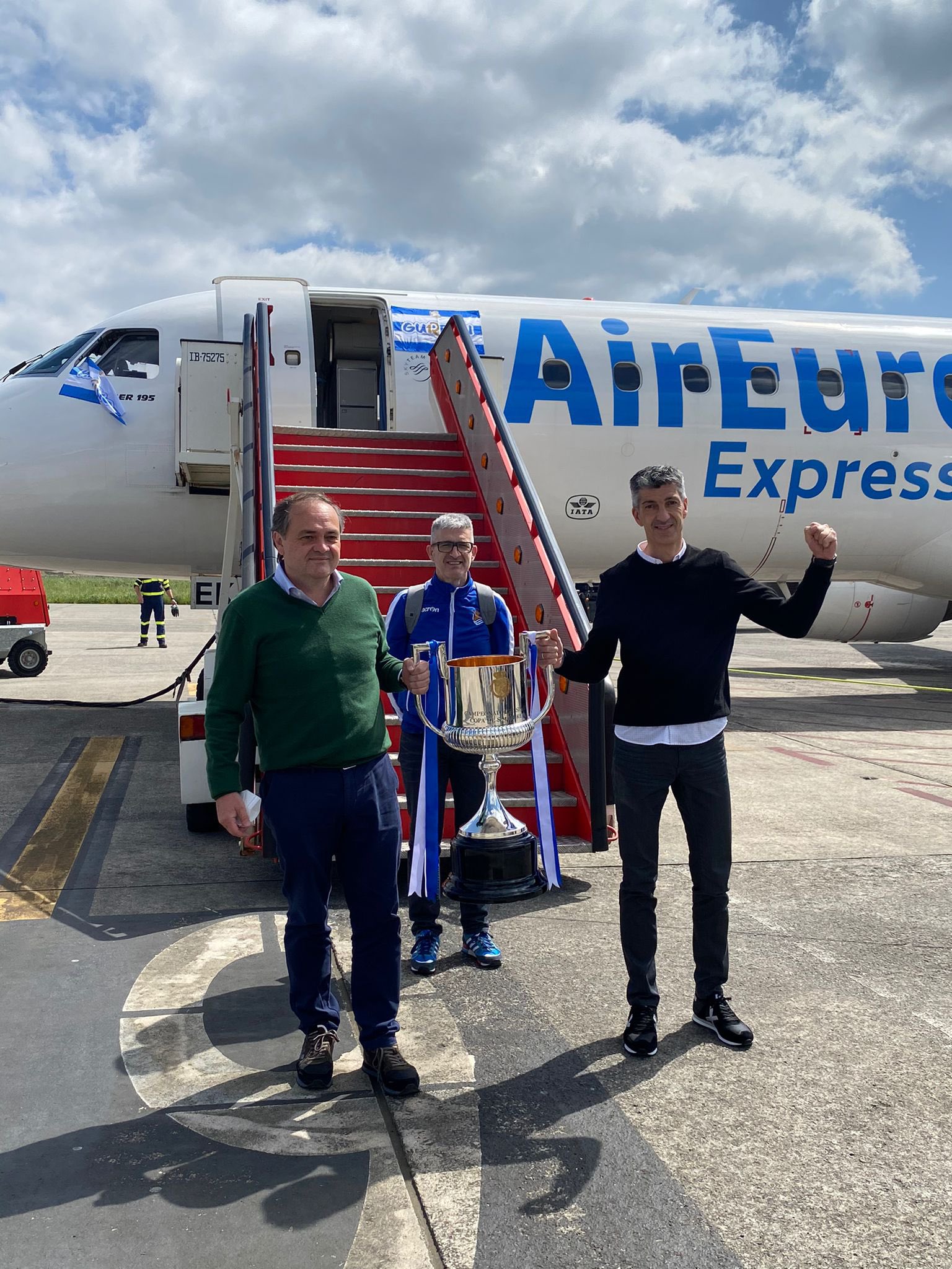 Los capitanes de la Real, Asier Illarramendi y Mikel Oyarzabal, han sido los encargados de bajar la copa del avión, seguidos del presidente del club, Jokin Aperribay, el director de fútbol, Roberto Olabe, y el entrenador, Imanol Alguacil.