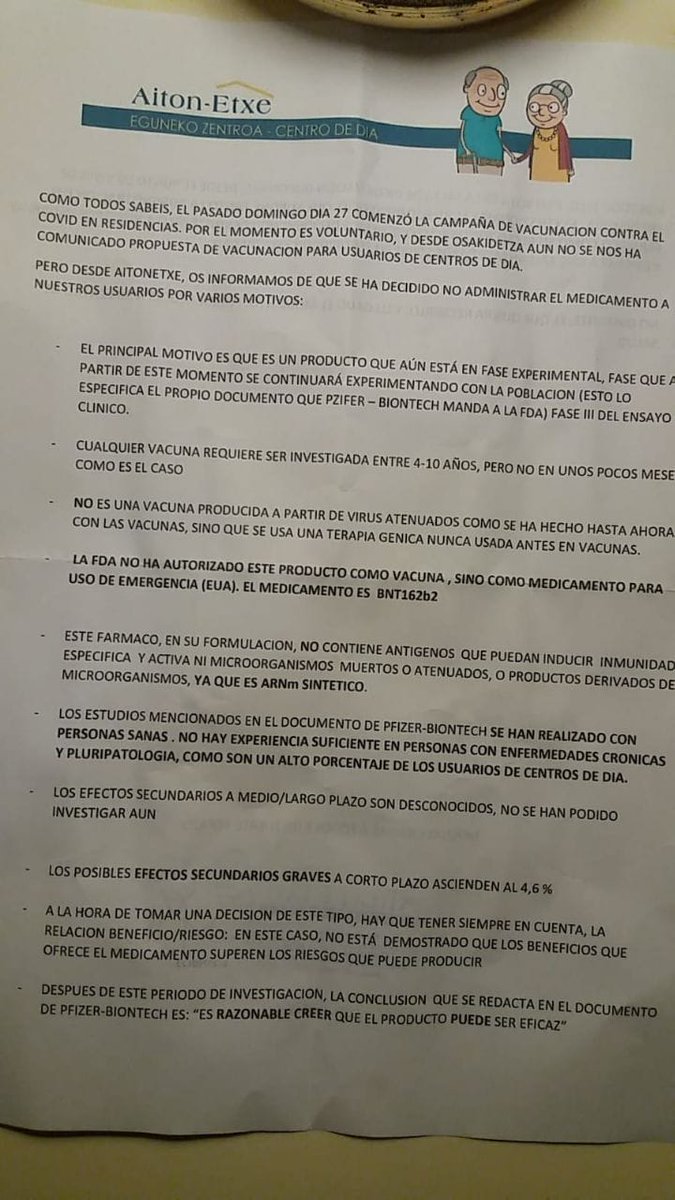 La Diputación de Gipuzkoa «garantizará el derecho a la vacunación de todos los usuarios de la red asistencial que así deseen hacerlo, ya que se trata de un derecho y de una decisión personal». Así ha respondido hoy el ente foral a la postura del centro de día Aiton-Etxe de Oiartzun después de que se hiciera público ayer que el centro ha decidido no administrar la vacuna a los usuarios alegando que el medicamento está en fase experimental (más detalles en la imagen). Además la Diputación ha anunciado que se pondrá en contacto con el centro de día Aiton-Etxe para conocer los motivos del escrito y, en su caso, se estudiarán y tomarán las medidas pertinentes.
