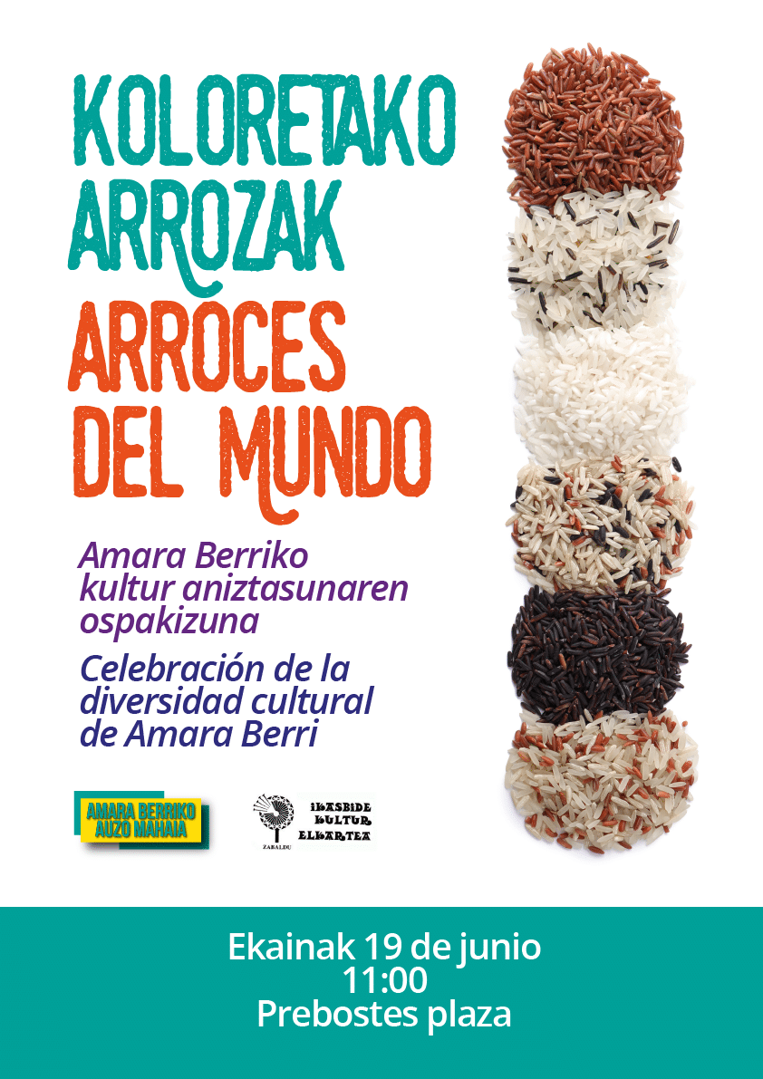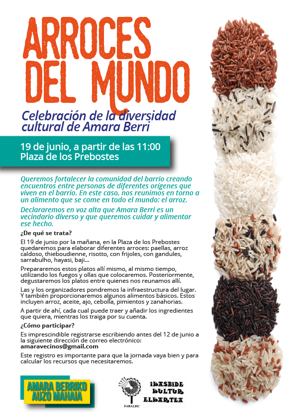 El 19 de junio a las 11 horas comenzará en la plaza de los Prebostes, en Amara Berri, un encuentro original ligado a la importante presencia de vecinos llegados desde tantas culturas y utilizando en ese hermanamiento entre todos la gastronomía, concretamente un producto cocinado en todo el mundo: el arroz.
