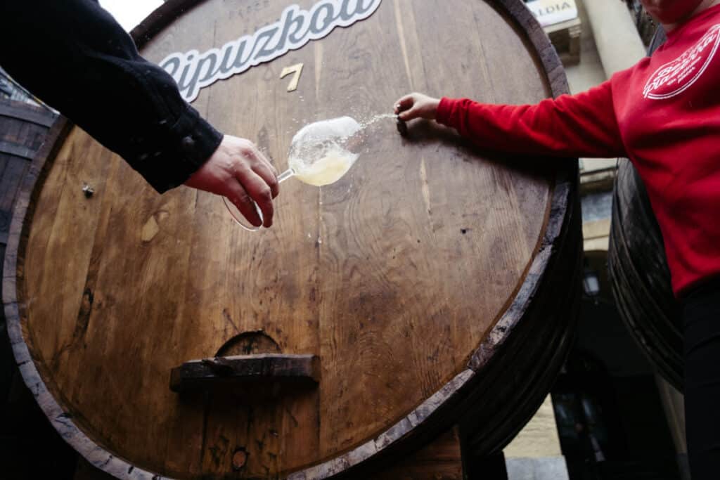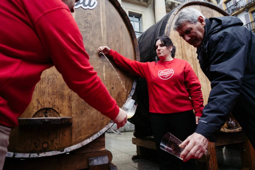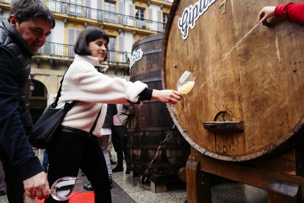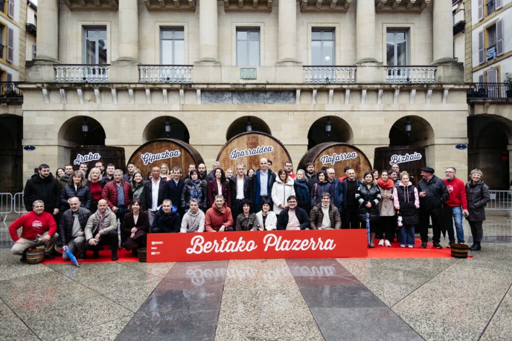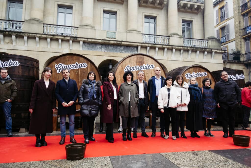 La consejera de Alimentación, Desarrollo Rural, Agricultura y Pesca del Gobierno Vasco, Amaia Barredo, y varios diputados forales de Gipuzkoa y Álava, han participado en el arranque oficial y conjunto de la nueva temporada de sidrerías con un ‘txotx’ o escanciado en varias barricas o ‘kupelas’ instaladas en la plaza de la Constitución de la Parte Vieja donostiarra.