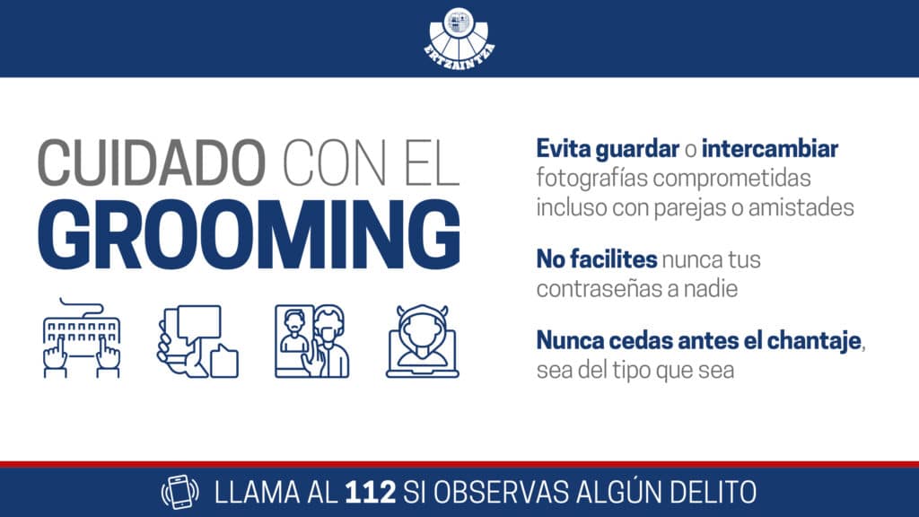 La Ertzaintza ha abierto diligencias como investigado a un joven, de 26 años, por un presunto caso de “grooming”, al haber realizado proposiciones de carácter sexual a una menor con la que previamente había compartido fotografías y vídeos a través de sus teléfonos móviles. Supuestamente el investigado se hizo pasar por menor de edad para ganarse la confianza de la víctima.
