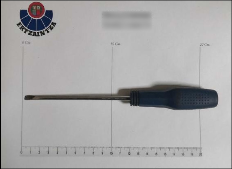 Instantes después se personó en el lugar un recurso de la Ertzaintza, que en el registro corporal de esta persona encontró herramientas como destornilladores, llave inglesa, elementos plásticos para la apertura de puertas, una llave ‘Bumping’ para la extracción de bombines, una navaja y un bombín de cerradura. Se procedió a la inspección de una de las puertas del inmueble comprobando que ésta tenía señales de forzamiento.
