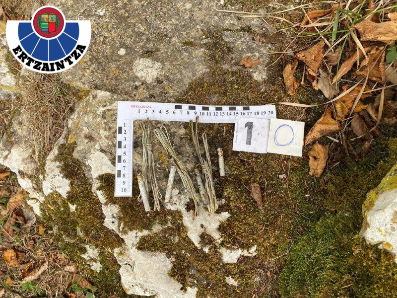 La Ertzaintza encontró el zulo en una cavidad entre las rocas en una pared vertical a una altura de unos 2 metros del suelo, hallándose el material ubicado en su interior cubierto con piedras. Dentro han aparecido ocho detonadores de diferentes tipos, restos de mecha, y una bolsa que contenía 2 kilos de explosivo tipo GOMA.
