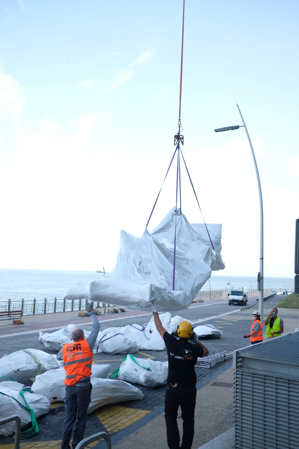 Goia y la propia Iglesias han acudido a primera hora de la mañana al Paseo Nuevo a ver el traslado de las piezas que completarán la escultura. También se encontraban allí el músico Alberto Iglesias, hermano de Cristina, y la familia de Haritz Galarraga, el piloto del helicóptero donostiarra que iba a encargarse de este trabajo pero falleció recientemente en un accidente. De hecho nada más llegar el alcalde y la artista donostiarra han depositado un ramo de flores en su memoria.